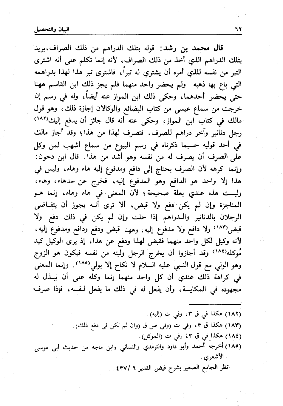 قال ابن دحون: وإنما كرهه لأن الصرف يحتاج إلى دافع ومدفوع إليه هاء وهاء، وليس في هذا إلا واحد هو الدافع وهو المدفوع إليه، فخرج عن حد هاء، وهاء، وليست هذه عندي بعلة صحيحة؛ لأن المعنى في هاء وهاء، إنما هو المناجزة وإن لم يكن دفع ولا قبض، ألا ترى أنه يجوز أن يتقاضى الرجلان بالدنانير والدراهم إذا حلت وإن لم يكن في ذلك دفع ولا قبض ولا دافع ولا مدفوع إليه، وهاهنا قبض ودفع ودافع ومدفوع إليه؛ لأنه وكيل لكل واحد منهما فقبض لهذا ودفع عن هذا، إذ يرى الوكيل كيد موكله، وقد أجازوا أن يخرج الرجل وليته من نفسه فيكون هو الزوج وهو الولي مع قول النبي - عَلَيْهِ السَّلَامُ -: «لا نكاح إلا بولي» .
