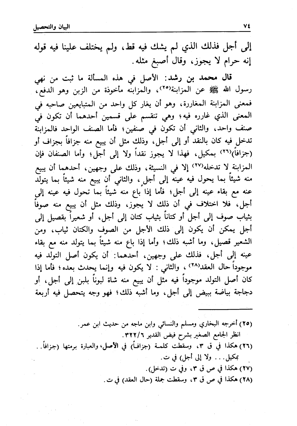 قال محمد بن رشد: الأصل في هذه المسألة ما ثبت من «نهي رسول الله - صَلَّى اللَّهُ عَلَيْهِ وَسَلَّمَ - عن المزابنة» ، والمزابنة مأخوذة من الزبن وهو الدفع، فمعنى المزابنة المغاررة، وهو أن يغار كل واحد من المتبايعين صاحبه في المعنى الذي غارره فيه؛ وهي تنقسم على قسمين: أحدهما: أن تكون في صنف واحد، والثاني: أن تكون في صنفين. فأما الصنف الواحد فالمزابنة تدخل فيه، كان بالنقد أو إلى أجل، وذلك مثل أن يبيع منه جزافا بجزاف أو جزافا بمكيل، فهذا لا يجوز نقدا ولا إلى أجل؛ وأما الصنفان فإن المزابنة لا تدخله إلا في النسيئة، وذلك على وجهين: أحدهما: أن يبيع منه شيئا بما يحول فيه عينه إلى أجل، والثاني: أن يبيع منه شيئا بما يتولد عنه مع بقاء عينه إلى أجل؛ فأما إذا باع منه شيئا بما تحول فيه عينه إلى أجل، فلا اختلاف في أن ذلك لا يجوز، وذلك مثل أن يبيع منه صوفا بثياب صوف إلى أجل أو كتانا بثياب كتان إلى أجل، أو شعيرا بقصيل إلى أجل يمكن أن يكون إلى ذلك الأجل من الصوف والكتان ثياب، ومن الشعير قصيل، وما أشبه ذلك.