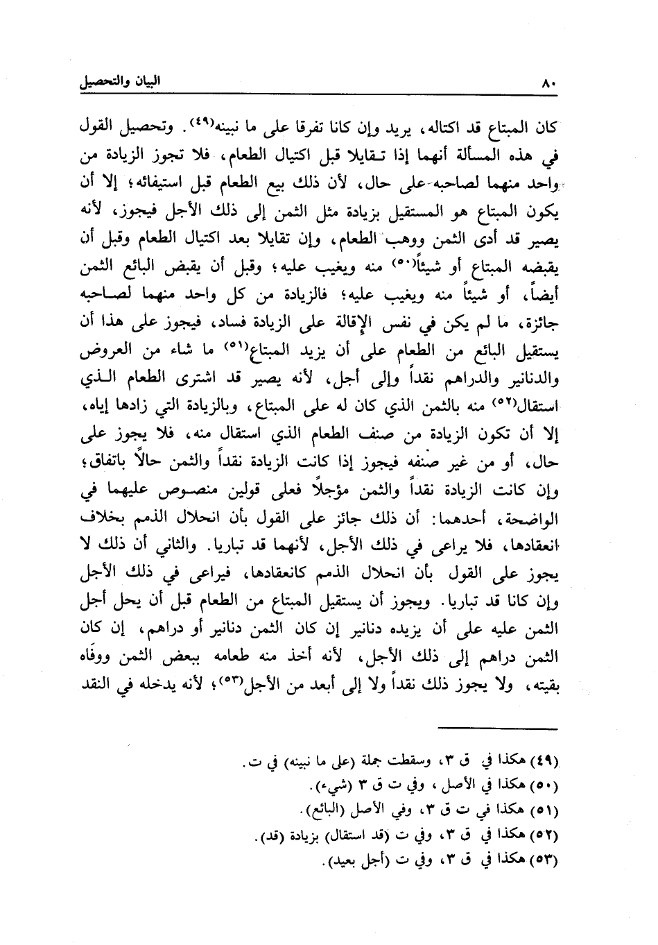 والثاني: أن ذلك لا يجوز على القول بأن انحلال الذمم كانعقادها، فيراعى في ذلك الأجل وإن كانا قد تباريا. ويجوز أن يستقيل المبتاع من الطعام قبل أن يحل أجل الثمن عليه على أن يزيده دنانير إن كان الثمن دنانير أو دراهم، إن كان الثمن دراهم إلى ذلك الأجل؛ لأنه أخذ منه طعامه ببعض الثمن ووفاه بقيته، ولا يجوز ذلك نقدا ولا إلى أبعد من الأجل؛ لأنه يدخله في النقد
