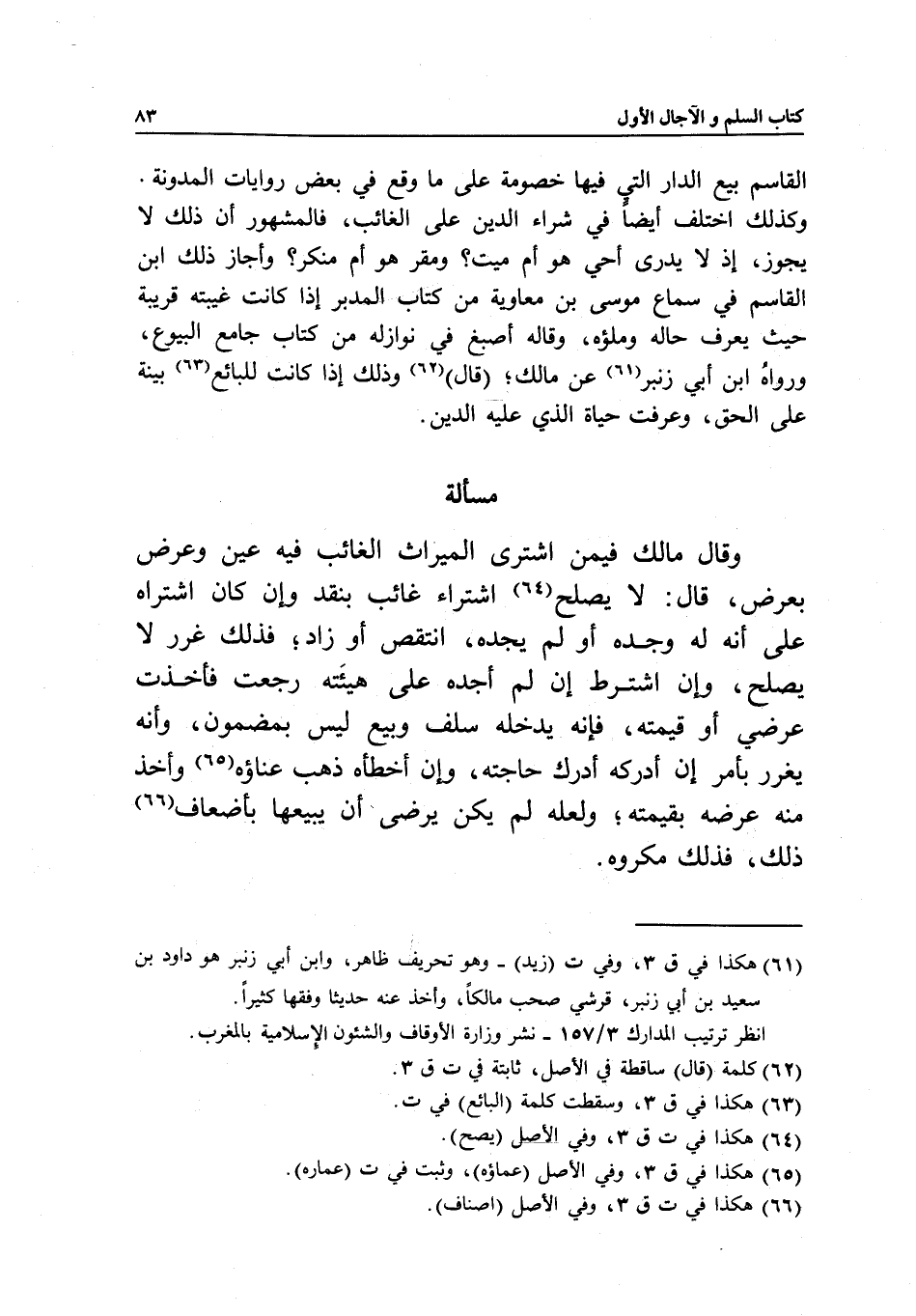 القاسم بيع الدار التي فيها خصومة على ما وقع في بعض روايات المدونة. وكذلك اختلف أيضا في شراء الدين على الغائب، فالمشهور أن ذلك لا يجوز، إذ لا يدرى أحي هو أم ميت؛ ومقر هو أم منكر؛ وأجاز ذلك ابن القاسم في سماع موسى بن معاوية من كتاب المدبر إذا كانت غيبته قريبة حيث يعرف حاله وملؤه، وقاله أصبغ في نوازله من كتاب جامع البيوع، ورواه ابن أبي زنبر عن مالك؛ (قال:) وذلك إذا كانت للبائع بينة على الحق، وعرفت حياة الذي عليه الدين.
