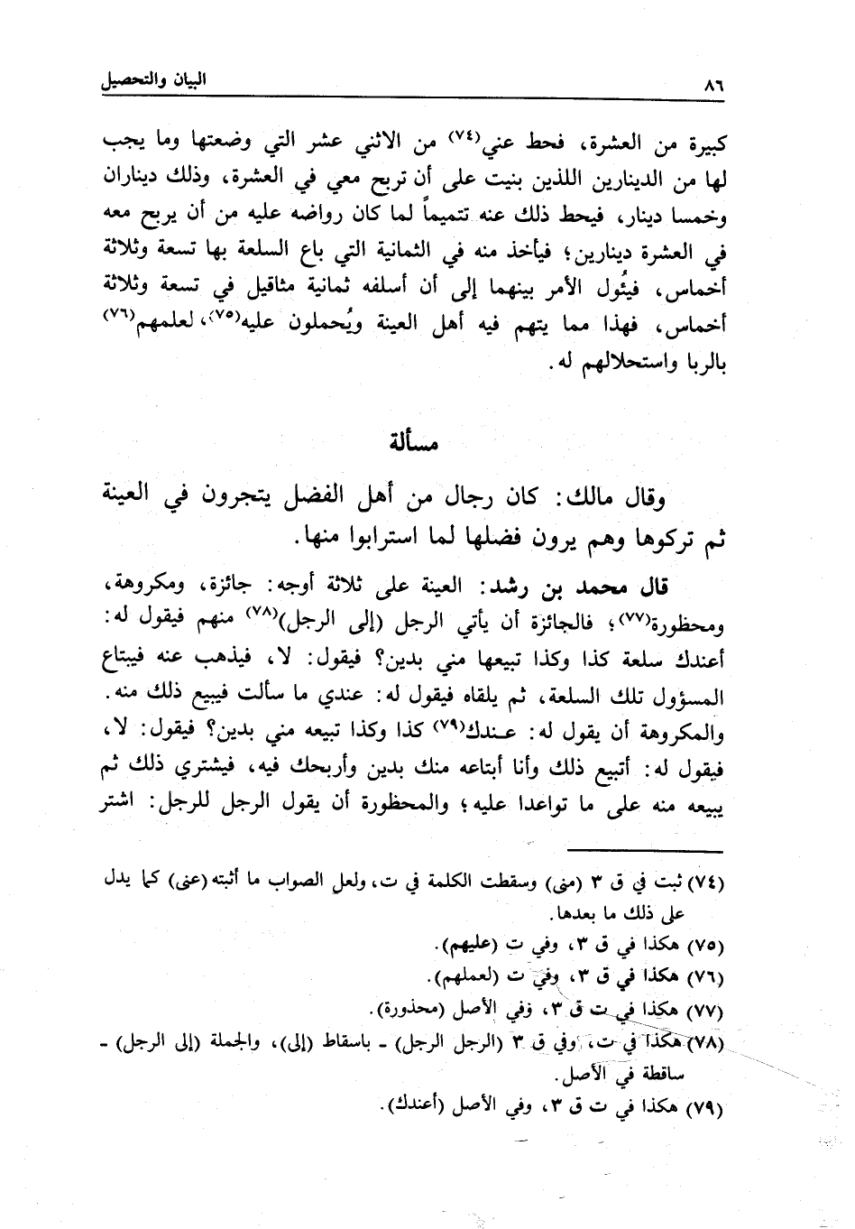 كبيرة من العشرة، فحط عني من الاثني عشر التي وضعتها وما يجب لها من الدينارين اللذين بنيت على أن تربح معي في العشرة، وذلك ديناران وخمسا دينار، فيحط ذلك عنه تتميما لما كان راوضه عليه من أن يربح معه في العشرة دينارين، فيأخذ منه في الثمانية التي باع السلعة بها تسعة وثلاثة أخماس، فيئول الأمر بينهما إلى أن أسلفه ثمانية مثاقيل في تسعة وثلاثة أخماس، فهذا مما يتهم فيه أهل العينة ويحملون عليه، لعلمهم بالربا واستحلالهم له.