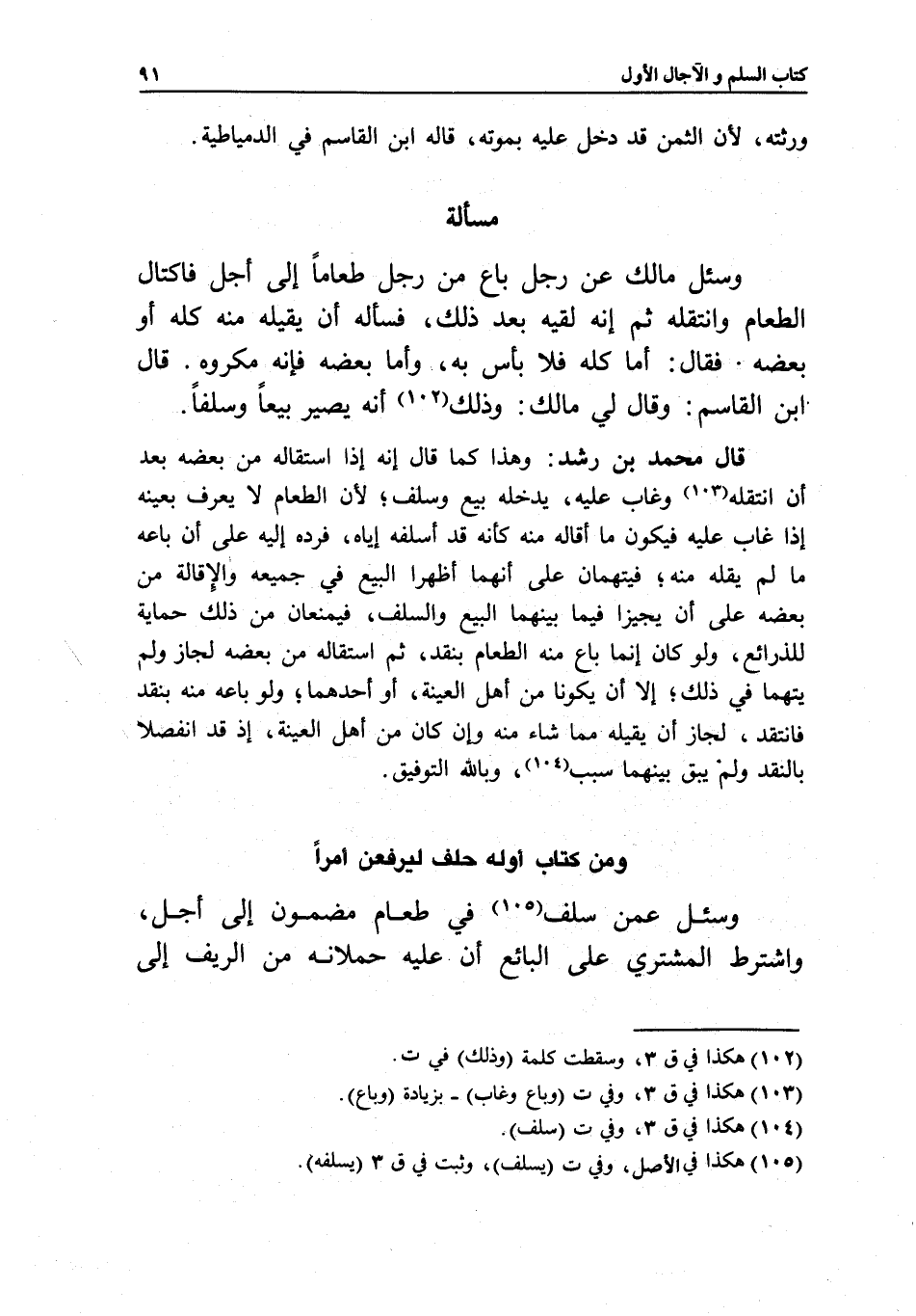 مسألة وسئل مالك: عن رجل باع من رجل طعاما إلى أجل فاكتال الطعام وانتقله، ثم إنه لقيه بعد ذلك، فسأله أن يقيله منه كله أو بعضه. فقال: أما كله فلا بأس به، وأما بعضه فإنه مكروه. قال ابن القاسم: وقال لي مالك: وذلك أنه يصير بيعا وسلفا.
