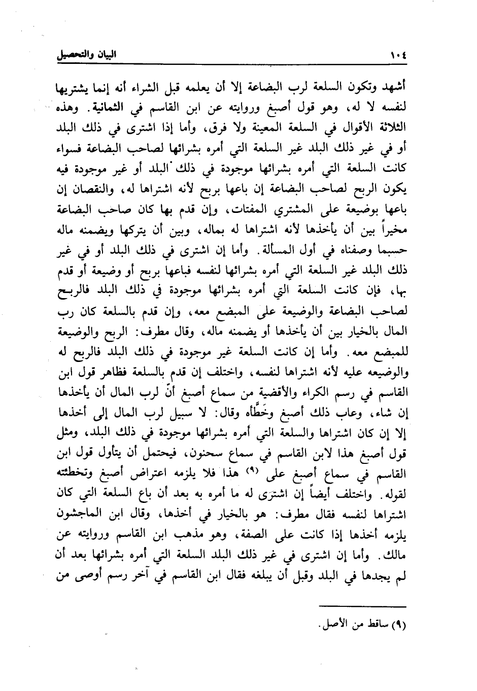 أشهد وتكون السلعة لرب البضاعة إلا أن يعلمه قبل الشراء أنه إنما يشتريها لنفسه لا له، وهو قول أصبغ وروايته عن ابن القاسم في الثمانية. وهذه الثلاثة الأقوال في السلعة المعينة ولا فرق، وأما إذا اشترى في ذلك البلد أو في غير ذلك البلد غير السلعة التي أمره بشرائها لصاحب البضاعة فسواء كانت السلعة التي أمره بشرائها موجودة في ذلك البلد أو غير موجودة فيه يكون الربح لصاحب البضاعة إن باعها بربح لأنه اشتراها له، والنقصان إن باعها بوضيعة على المشتري المفتات، وإن قدم بها كان صاحب البضاعة مخيرا بيمين أن يأخذها لأنه اشتراها له بماله، وبين أن يتركها ويضمنه ماله حسبما وصفناه في أول المسألة. وأما إن اشترى في ذلك البلد أو في غير ذلك البلد غير السلعة التي أمره بشرائها لنفسه فباعها بربح أو وضيعة أو قدم بها، فإن كانت السلعة التي أمره بشرائها موجودة في ذلك البلد فالربح لصاحب البضاعة والوضيعة على المبضع معه، وإن قدم بالسلعة كان رب المال بالخيار بين أن يأخذها أو يضمنه ماله، وقال مطرف: الربح والوضيعة للمبضع سعه. وأما إن كانت السلعة غير موجودة في ذلك البلد فالربح له والوضيعة عليه لأنه اشتراها لنفسه، واختلف إن قدم بالسلعة فظاهر قول ابن القاسم في رسم الكراء والأقضية من سماع أصبغ أن لرب المال أن يأخذها إن شاء، وعاب ذلك أصبغ وخطأه وقال: لا سبيل لرب المال إلى أخذها إلا إن كان اشتراها والسلعة التي أمره بشرائها موجودة في ذلك البلد، ومثل قول أصبغ هذا لابن القاسم في سماع سحنون، فيحتمل أن يتأول قول ابن القاسم في سماع أصبغ على هذا فلا يلزمه اعتراض أصبغ وتخطئته لقوله. واختلف أيضا إن اشترى له ما أمره به بعد أن باع السلعة التي كان اشتراها لنفسه فقال مطرف: هو بالخيار في أخذها، وقال ابن الماجشون: يلزمه أخذها إذا كانت على الصفة، وهو مذهب ابن القاسم وروايته عن مالك. وأما إن اشترى في غير ذلك البلد السلعة التي أمره بشرائها بعد أن لم يجد مما في البلد وقبل أن يبلغه فقال ابن القاسم في آخر رسم أوصى من