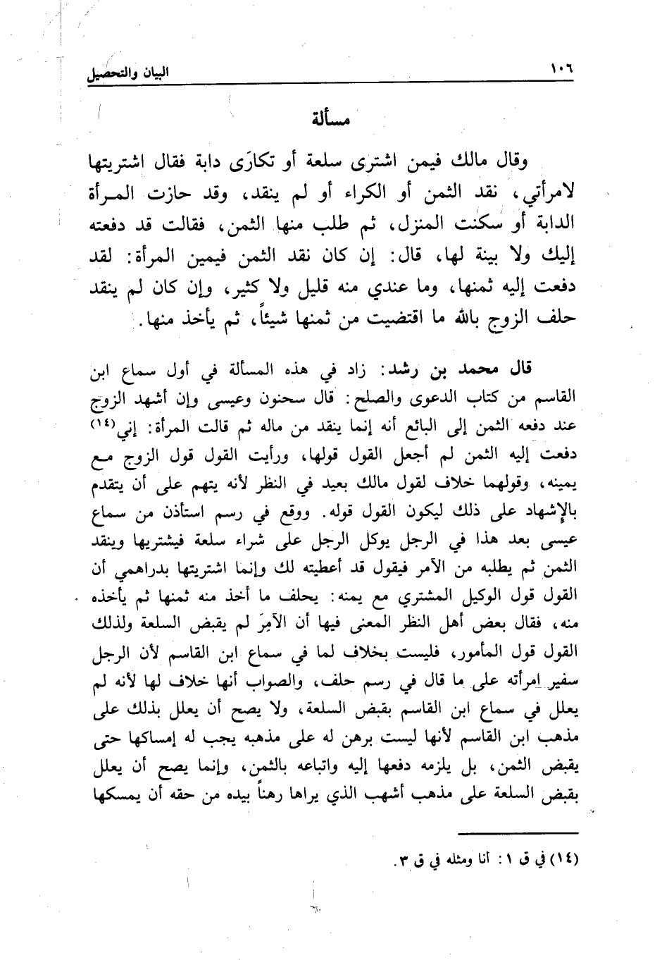 قال محمد بن رشد: زاد في هذه المسألة في أول سماع ابن القاسم من كتاب الدعوى والصلح: قال سحنون وعيسى وإن أشهد الزوج عند دفعه الثمن إلى البائع أنه إنما ينقد من ماله ثم قالت المرأة: إني دفعت إليه الثمن لم أجعل القول قولها، ورأيت القول قول الزوج مع يمينه، وقولهما خلاف لقول مالك بعيد في النظر؛ لأنه يتهم على أن يتقدم بالإشهاد على ذلك ليكون القول قوله. ووقع في رسم استأذن من سماع عيسى بعد هذا في الرجل يوكل الرجل على شراء سلعة فيشتريها وينقد الثمن ثم يطلبه من الآمر فيقول: قد أعطيته لك وإنما اشتريتها بدراهمي أن القول قول الوكيل المشتري مع يمينه: يحلف ما أخذ منه ثمنها ثم يأخذه منه، فقال بعض أهل النظر: المعنى فيها أن الآمر لم يقبض السلعة ولذلك القول قول المأمور، فليست بخلاف لما في سماع ابن القاسم لأن الرجل سفير امرأته على ما قال في رسم حلف، والصواب أنها خلاف لها لأنه لم يعلل في سماع ابن القاسم بقبض السلعة، ولا يصح أن يعلل بذلك على مذهب ابن القاسم لأنها ليست برهن له على مذهبه يجب له إمساكها حتى يقبض الثمن، بل يلزمه دفعها إليه واتباعه بالثمن، وإنما يصح أن يعلل بقبض السلعة على مذهب أشهب الذي يراها رهنا بيده من حقه أن يمسكها
