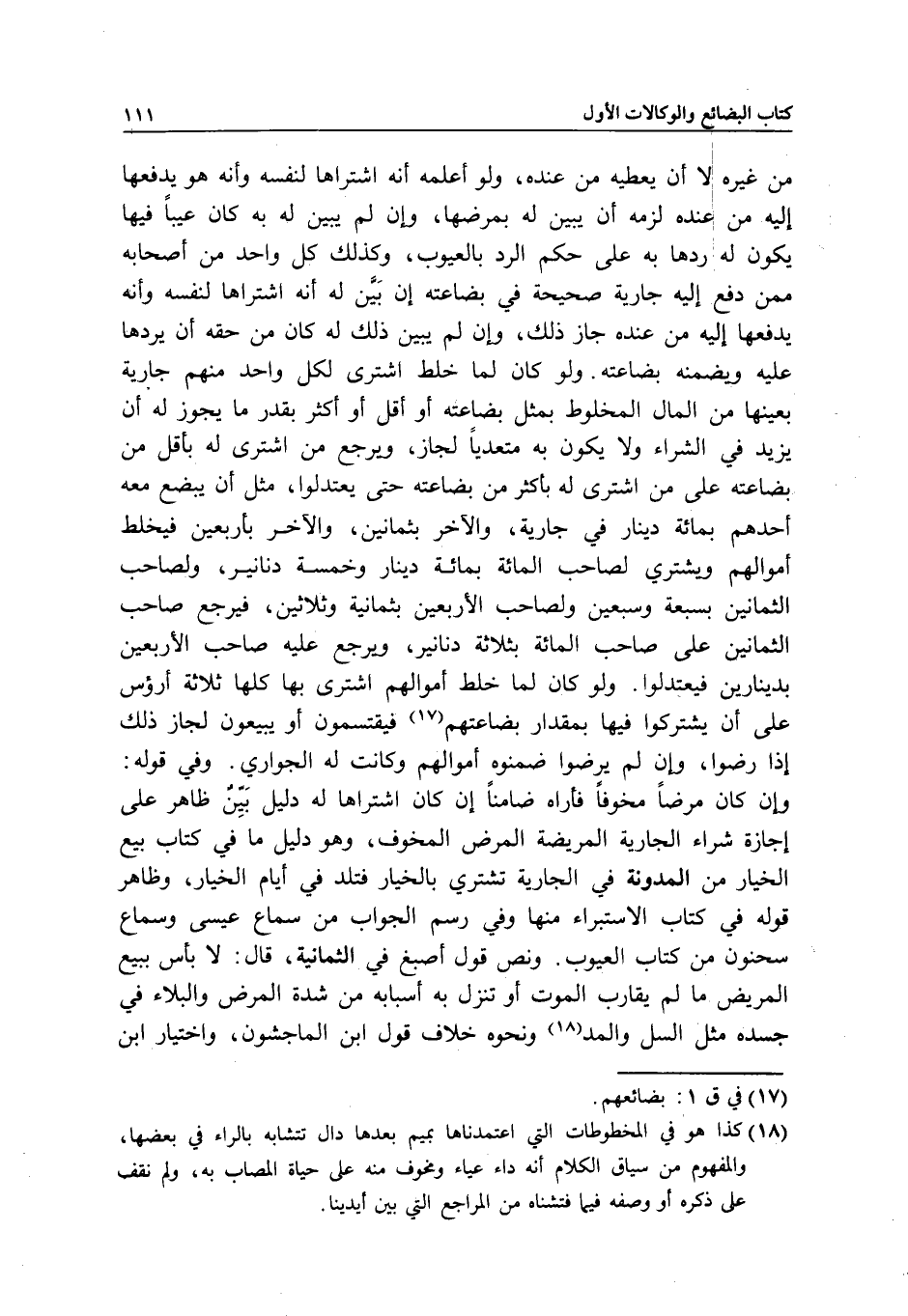 من غيره لا أن يعطيه من عنده، ولو أعلمه أنه اشتراها لنفسه وأنه هو يدفعها إليه من عنده لزمه أن يبين له بمرضها، وإن لم يبين له به كان عيبا فيها يكون له ردها به على حكم الرد بالعيوب، وكذلك كل واحد من أصحابه ممن دفع إليه جارية صحيحة في بضاعته إن بين له أنه اشتراها لنفسه وأنه يدفعها إليه أن عنده جاز ذلك، وإن لم يبين ذلك له كان من حقه أن يردها عليه ويضمنه بضاعته. ولو كان لما خلط اشترى لكل واحد منهم جارية بعينها من المال المخلوط بمثل بضاعته أو أقل أو أكثر بقدر ما يجوز له أن يزيد في الشراء ولا يكون به متعديا لجاز، ويرجع من اشترى له بأقل بضاعته على من اشترى له بأكثر من بضاعته حتى يعتدلوا، مثل أن يبضع معه أحدهم بمائة دينار في جارية، والآخر بثمانين، والآخر بأربعين فيخلط أموالهم ويشتري لصاحب المائة بمائة دينار وخمسة دنانير، ولصاحب الثمانين بسبعة وسبعين ولصاحب الأربعين بثمانية وثلاثين، فيرجع صاحب الثمانين على صاحب المائة بثلاثة دنانير، ويرجع عليه صاحب الأربعين بدينارين فيعتدلوا. ولو كان لما خلط أموالهم اشترى بها كلها ثلاثة أرؤس على أن يشتركوا فيها بمقدار بضاعتهم فيقتسمون أو يبيعون لجاز ذلك إذا رضوا، وإن لم يرضوا ضمنوه أموالهم وكانت له الجواري. وفي قوله: وإن كان مرضا مخوفا فأراه ضامنا إن كان اشتراها له دليل بين ظاهر على إجازة شراء الجارية المريضة المرض المخوف، وهو دليل ما في كتاب بيع الخيار من المدونة في الجارية تشتري بالخيار فتلد في أيام الخيار، وظاهر قوله في كتاب الاستبراء منها وفي رسم الجواب من سماع عيسى وسماع سحنون من كتاب العيوب. ونص قول أصبغ في الثمانية، قال: لا بأس ببيع المريض ما لم يقارب الموت أو تنزل به أسبابه من شدة المرض والبلاء في جسده مثل السل والمد ونحوه خلاف قول ابن الماجشون، واختيار ابن