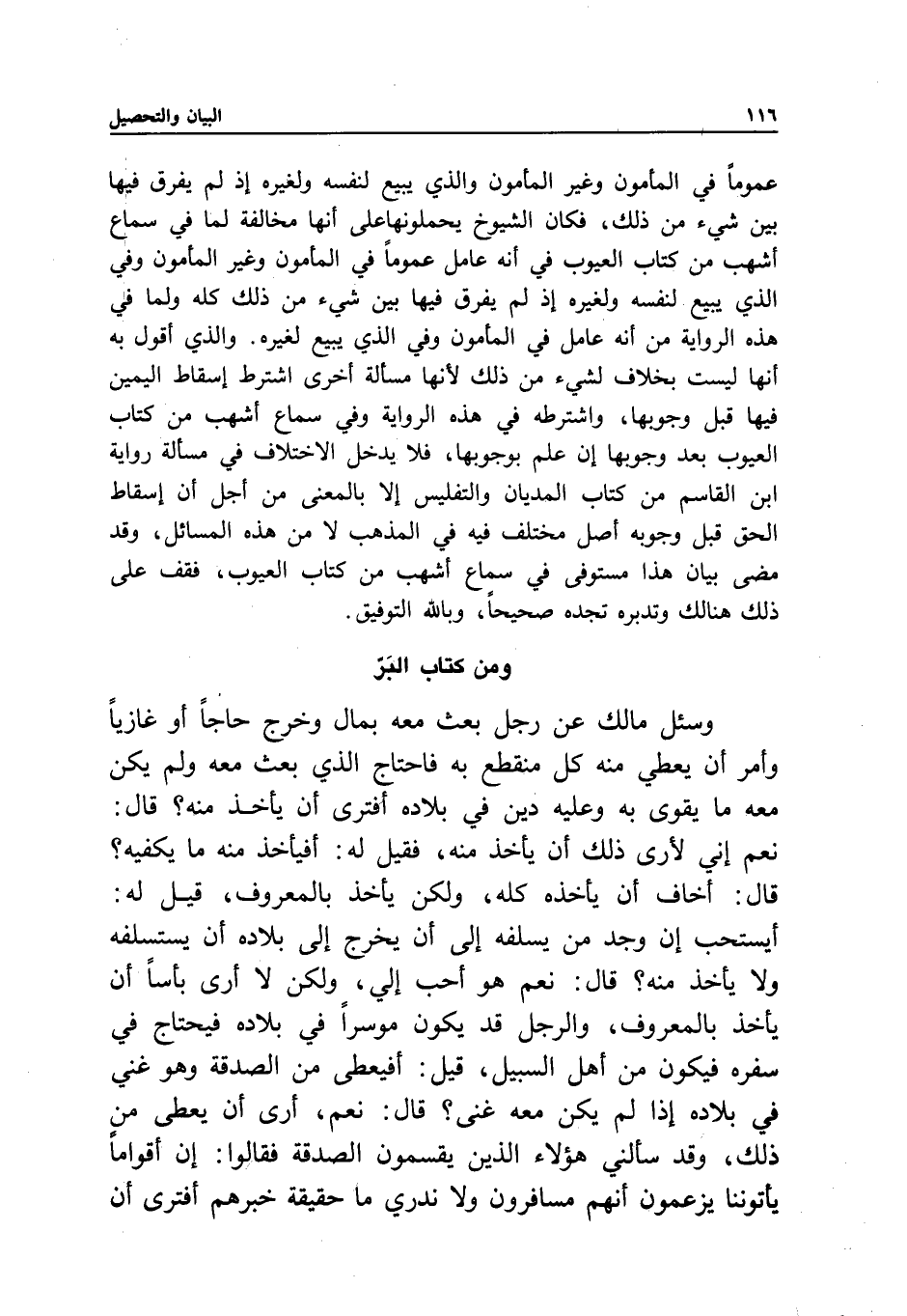 عموما في المأمون وغير المأمون والذي يبيع لنفسه ولغيره إذ لم يفرق فيها بين شيء من ذلك، فكان الشيوخ يحملونها على أنها مخالفة لما في سماع أشهب من كتاب العيوب في أنه عامل عموما في المأمون وغير المأمون وفي الذي يبيع لنفسه ولغيره إذ لم يفرق فيها بين شيء من ذلك كله ولما في هذه الرواية من أنه عامل في المأمون وفي الذي يبيع لغيره. والذي أقول به أنها ليست بخلاف لشيء من ذلك؛ لأنها مسألة أخرى اشترط إسقاط اليمين فيها قبل وجوبها، واشترطه في هذه الرواية وفي سماع أشهب من كتاب العيوب بعد وجوبها إن علم بوجوبها، فلا يدخل الاختلاف في مسألة رواية ابن القاسم من كتاب المديان والتفليس إلا بالمعنى من أجل أن إسقاط الحق قبل وجوبه أصل مختلف فيه في المذهب لا من هذه المسائل، وقد مضى بيان هذا مستوفى في سماع أشهب من كتاب العيوب، فقف على ذلك هنالك وتدبره تجده صحيحا، وبالله التوفيق.