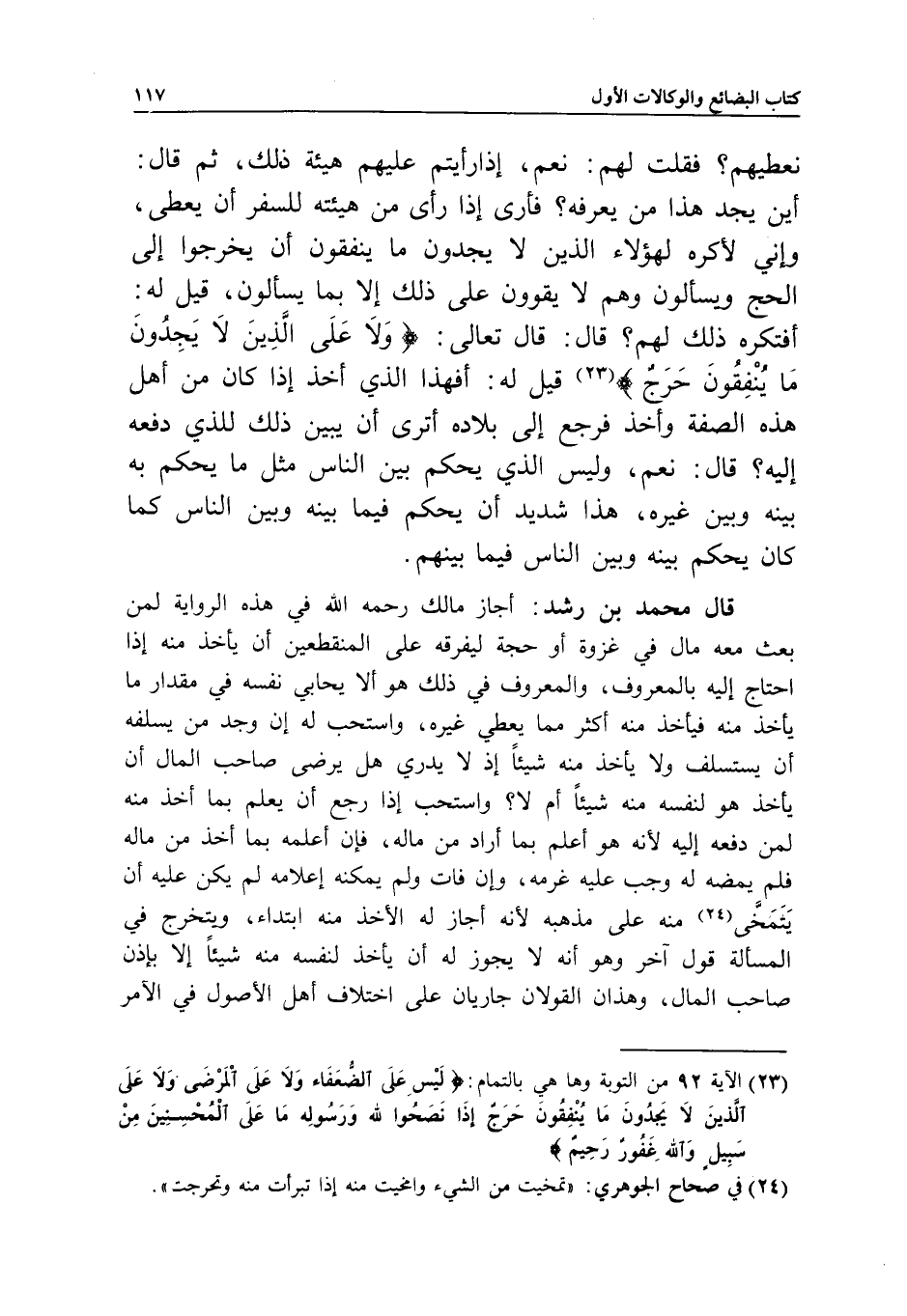 قال محمد بن رشد: أجاز مالك - رَحِمَهُ اللَّهُ - في هذه الرواية لمن بعث معه مال في غزوة أو حجة ليفرقه على المنقطعين أن يأخذ منه إذا احتاج إليه بالمعروف، والمعروف في ذلك هو ألا يحابي نفسه في مقدار ما يأخذ منه فيأخذ منه أكثر مما يعطي غيره، واستحب له إن وجد من يسلفه أن يستسلف ولا يأخذ منه شيئا إذ لا يدري هل يرضى صاحب المال أن يأخذ هو لنفسه منه شيئا أم لا؟ واستحب إذا رجع أن يعلم بما أخذ منه لمن دفعه إليه لأنه هو أعلم بما أراد من ماله، فإن أعلمه بما أخذ من ماله فلم يمضه له وجب عليه غرمه، وإن فات ولم يمكنه إعلامه لم يكن عليه أن يتمخى منه على مذهبه لأنه أجاز له الأخذ منه ابتداء، ويتخرج في المسألة قول آخر وهو أنه لا يجوز له أن يأخذ لنفسه منه شيئا إلا بإذن صاحب المال، وهذان القولان جاريان على اختلاف أهل الأصول في الآمر