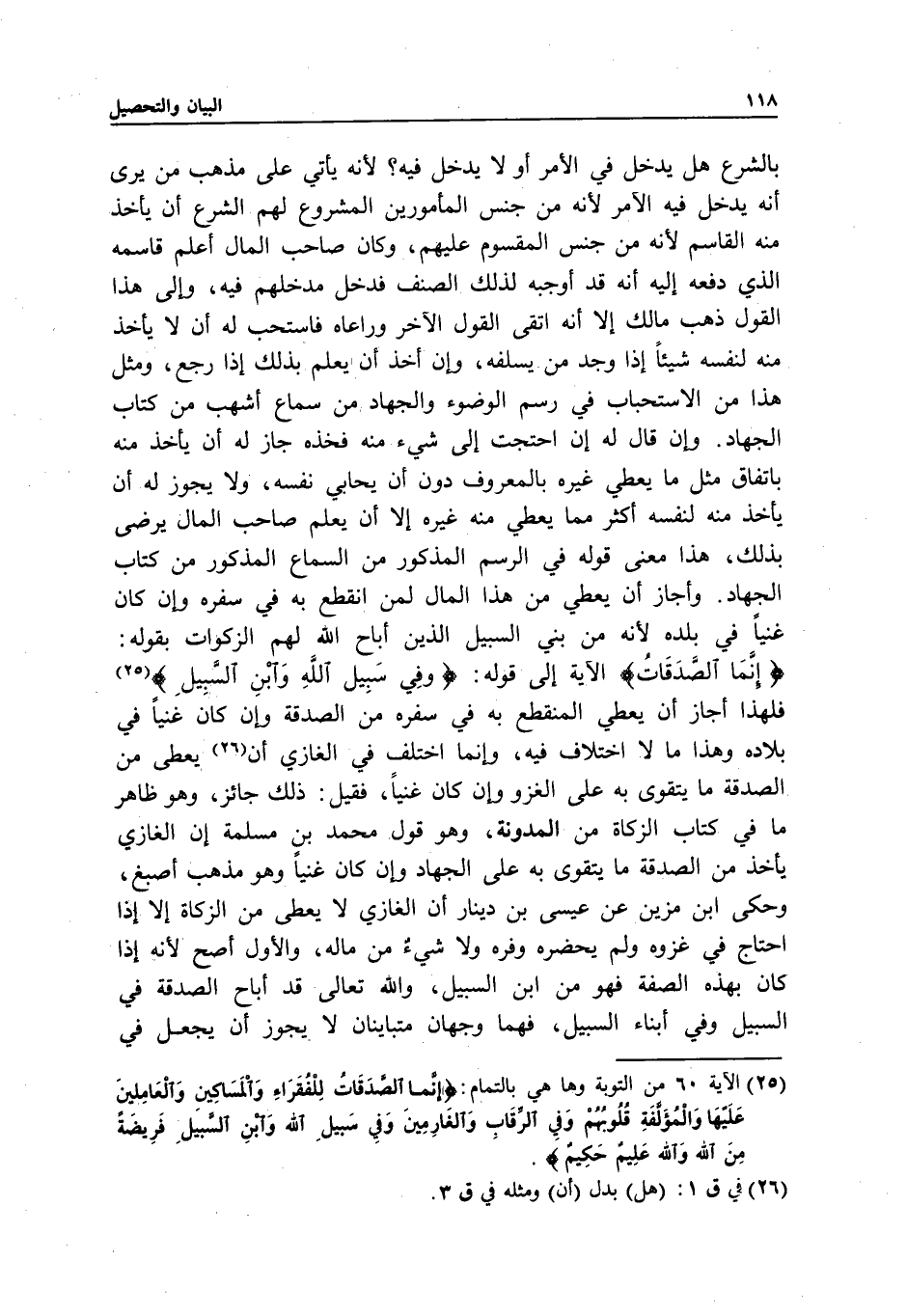 بالشرع هل يدخل في الآمر أو لا يدخل فيه؟ لأنه يأتي على مذهب من يرى أنه يدخل فيه الآمر لأنه من جنس المأمورين المشروع لهم الشرع أن يأخذ منه القاسم؛ لأنه من جنس المقسوم عليهم، وكان صاحب المال أعلم قاسمه الذي دفعه إليه أنه قد أوجبه لذلك الصنف فدخل مدخلهم فيه، وإلى هذا القول ذهب مالك إلا أنه اتقى القول الآخر وراعاه فاستحب له أن لا يأخذ منه لنفسه شيئا إذا وجد من يسلفه، وإن أخذ أن يعلم بذلك إذا رجع، ومثل هذا من الاستحباب في رسم الوضوء والجهاد من سماع أشهب من كتاب الجهاد. وإن قال له: إن احتجت إلى شيء منه فخذه جاز له أن يأخذ منه باتفاق مثل ما يعطي غيره بالمعروف دون أن يحابي نفسه، ولا يجوز له أن يأخذ منه لنفسه أكثر مما يعطي منه غيره إلا أن يعلم صاحب المال يرضى بذلك، هذا معنى قوله في الرسم المذكور من السماع المذكور من كتاب الجهاد. وأجاز أن يعطي من هذا المال لمن انقطع به في سفره وإن كان غنيا في بلده لأنه من بني السبيل الذين أباح الله لهم الزكوات بقوله: {إِنَّمَا الصَّدَقَاتُ} [التوبة: 60] الآية إلى قوله: {وَفِي سَبِيلِ اللَّهِ وَابْنِ السَّبِيلِ} [التوبة: 60] فلهذا أجاز أن يعطي المنقطع به في سفره من الصدقة وإن كان غنيا في بلاده وهذا ما لا اختلاف فيه، وإنما اختلف في الغازي أن يعطى من الصدقة ما يتقوى به على الغزو وإن كان غنيا، فقيل: ذلك جائز، وهو ظاهر ما في كتاب الزكاة من المدونة، وهو قول محمد بن مسلمة إن الغازي يأخذ من الصدقة ما يتقوى به على الجهاد وإن كان غنيا وهو مذهب أصبغ، وحكى ابن مزين عن عيسى بن دينار أن الغازي لا يعطى من الزكاة إلا إذا احتاج في غزوه ولم يحضره وفره ولا شيء من ماله، والأول أصح لأنه إذا كان بهذه الصفة فهو من ابن السبيل، والله تعالى قد أباح الصدقة في السبيل وفي أبناء السبيل، فهما وجهان متباينان لا يجوز أن يجعل في