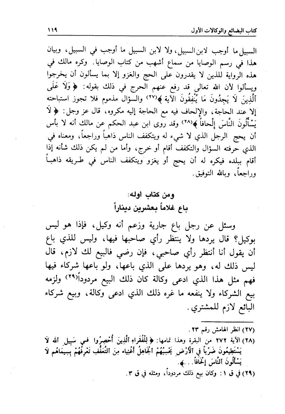 باع غلاما بعشرين دينارا وسئل عن رجل باع جارية وزعم أنه وكيل، فإذا هو ليس بوكيل؟ قال: يردها ولا ينتظر رأي صاحبها فيها، وليس للذي باع أن يقول أنا أنتظر رأي صاحبي، فإن رضي فالبيع لك لازم، قال: ليس ذلك له، وهو يردها على الذي باعها، ولو باعها شركاء فيها فهم مثل هذا الذي ادعى وكالة كان ذلك البيع مردودا ولزمه بيع الشركاء ولا ينفعه ما غره ذلك الذي ادعى وكالة، وبيع شركاء البائع لازم للمشتري.