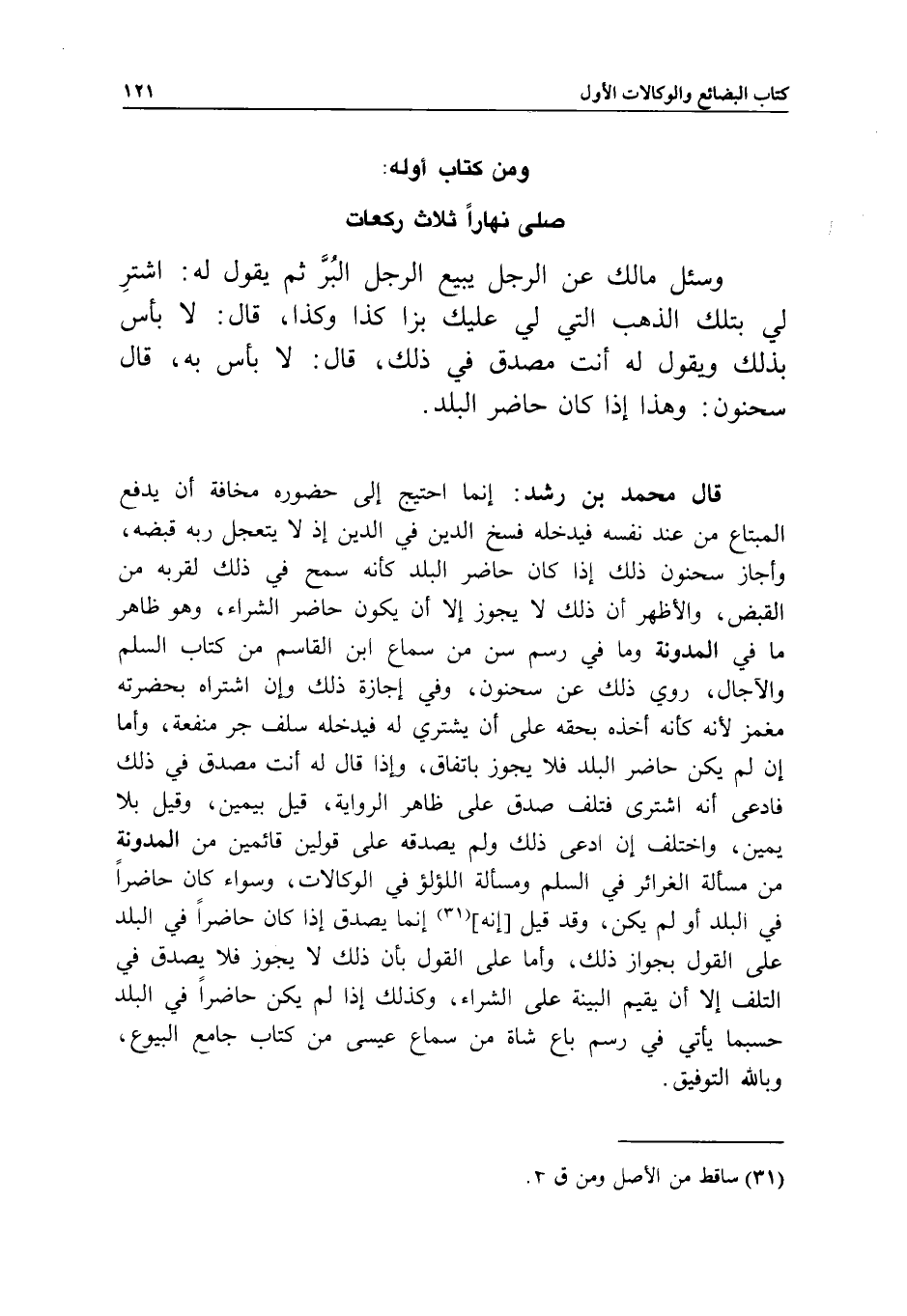 ومن كتاب أوله: صلى نهارا ثلاث ركعات وسئل مالك عن الرجل يبيع الرجل البر ثم يقول له: اشتر لي بتلك الذهب التي لي عليك بزا كذا وكذا، قال: لا بأس بذلك ويقول له: أنت مصدق في ذلك، قال: لا بأس به، قال سحنون: وهذا إذا كان حاضر البلد.