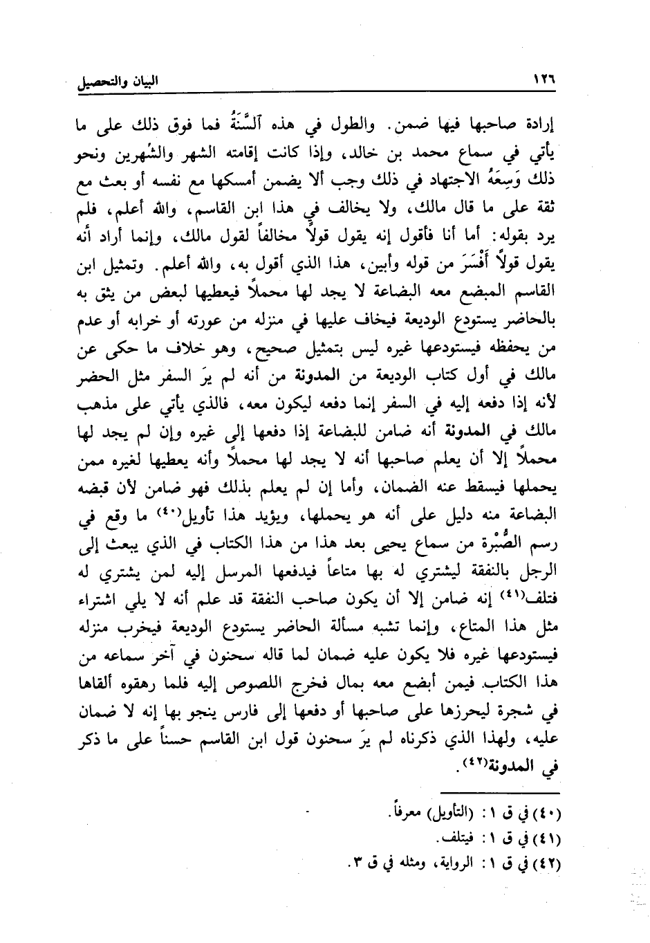 وتمثيل ابن القاسم المبضع معه البضاعة لا يجد لها محملا فيعطيها لبعض من يثق به بالحاضر يستودع الوديعة فيخاف عليها في منزله من عورته أو خرابه أو عدم من يحفظه فيستودعها غيره ليس بتمثيل صحيح، وهو خلاف ما حكى عن مالك في أول كتاب الوديعة من المدونة من أنه لم ير السفر مثل الحضر؛ لأنه إذا دفعه إليه في السفر إنما دفعه ليكون معه، فالذي يأتي على مذهب مالك في المدونة أنه ضامن للبضاعة إذا دفعها إلى غيره وإن لم يجد لها محملا إلا أن يعلم صاحبها أنه لا يجد لها محملا وأنه يعطيها لغيره ممن يحملها فيسقط عنه الضمان، وأما إن لم يعلم بذلك فهو ضامن؛ لأن قبضه البضاعة منه دليل على أنه هو يحملها، ويؤيد هذا تأويل ما وقع في رسم الصبرة من سماع يحيى بعد هذا من هذا الكتاب في الذي يبعث إلى الرجل بالنفقة ليشتري له بها متاعا فيدفعها المرسل إليه لمن يشتري له فتلف إنه ضامن إلا أن يكون صاحب النفقة قد علم أنه لا يلي اشتراء مثل هذا المتاع، وإنما تشبه مسألة الحاضر يستودع الوديعة فيخرب منزله فيستودعها غيره فلا يكون عليه ضمان لما قاله سحنون في آخر سماعه من هذا الكتاب. فيمن أبضع معه بمال فخرج اللصوص إليه فلما رهقوه ألقاها في شجرة ليحرزها على صاحبها أو دفعها إلى فارس ينجو بها إنه لا ضمان عليه، ولهذا الذي ذكرناه لم ير سحنون قول ابن القاسم حسنا على ما ذكر في المدونة.