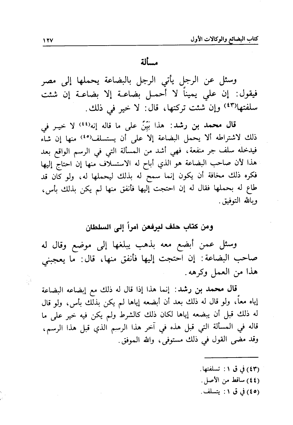 مسألة وسئل عن الرجل يأتي الرجل بالبضاعة يحملها إلى مصر فيقول: إن علي يمينا لا أحمل بضاعة إلا بضاعة إن شئت سلفتها وإن شئت تركتها، قال: لا خير في ذلك.