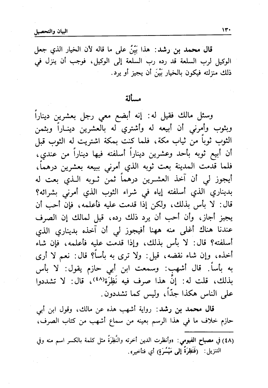 مسألة وسئل مالك فقيل له: إنه أبضع معي رجل بعشرين دينارا وبثوب وأمرني أن أبيعه له وأشتري له بالعشرين دينارا وبثمن الثوب ثوبا من ثياب مكة، فلما كنت بمكة اشتريت له الثوب قبل أن أبيع ثوبه بأحد وعشرين دينارا أسلفته فيها دينارا من عندي، فلما قدمت المدينة بعت ثوبه الذي أمرني ببيعه بعشرين درهما، أيجوز لي أن آخذ العشرين درهما ثمن ثوبه الذي بعت له بديناري الذي أسلفته إياه في شراء الثوب الذي أمرني بشرائه؟ قال: لا بأس بذلك، ولكن إذا قدمت عليه فأعلمه، فإن أحب أن يجيز أجاز، وإن أحب أن يرد ذلك رده، قيل لمالك: إن الصرف عندنا هناك أغلى منه ههنا أفيجوز لي أن آخذه بديناري الذي أسلفته؟ قال: لا بأس بذلك، وإذا قدمت عليه فأعلمه، فإن شاء أخذه، وإن شاء نقضه، قيل: ولا ترى به بأسا؟ قال: نعم لا أرى به بأسا. قال أشهب: وسمعت ابن أبي حازم يقول: لا بأس بذلك، قلت له: إن هذا صرف فيه نظرة، قال: لا تشددوا على الناس هكذا جدا، وليس كما تشددون.