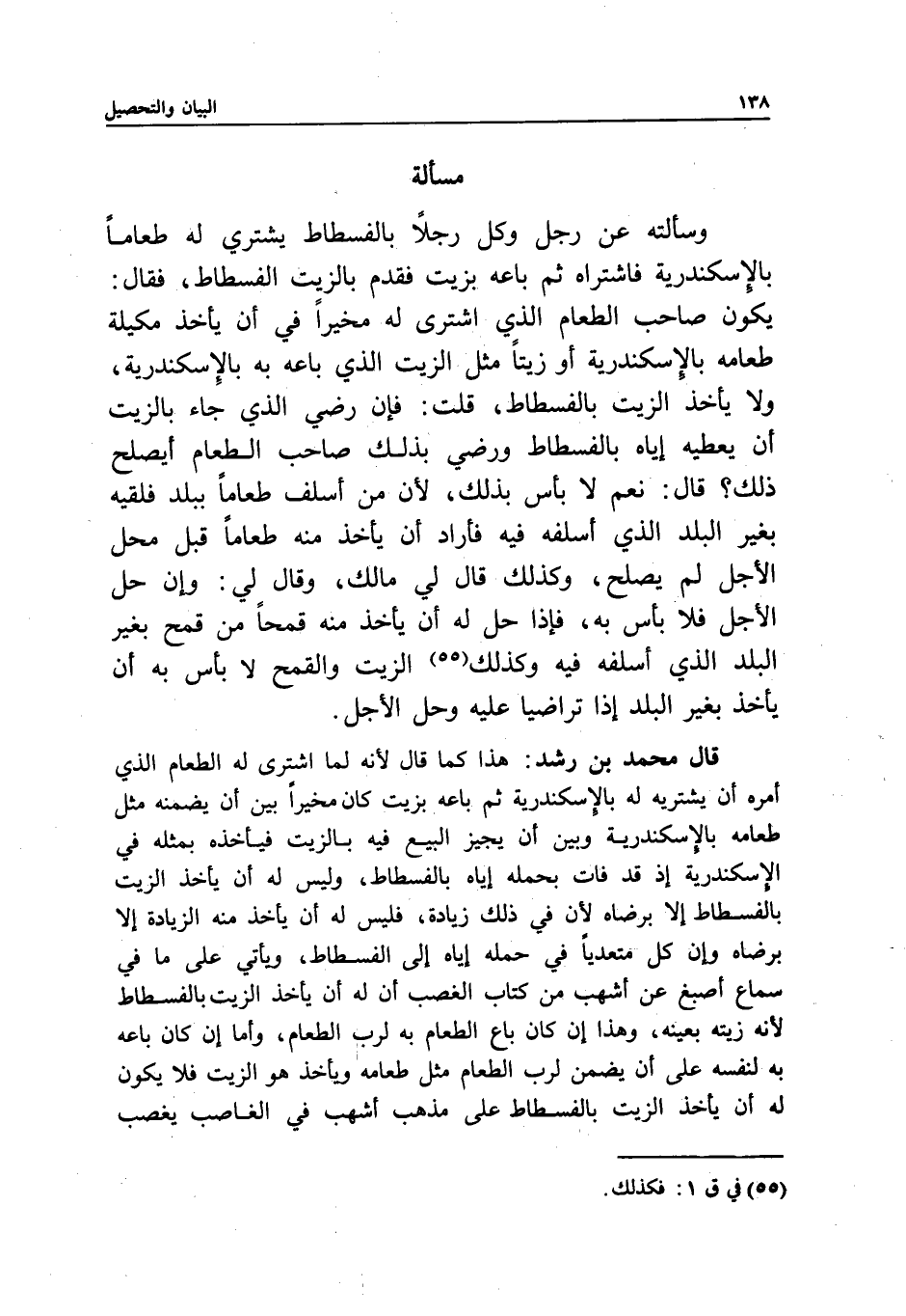 مسألة وسألته عن رجل وكل رجلا بالفسطاط يشتري له طعاما بالإسكندرية فاشتراه ثم باعه بزيت فقدم بالزيت الفسطاط، فقال: يكون صاحب الطعام الذي اشترى له مخيرا في أن يأخذ مكيلة طعامه بالإسكندرية أو زيتا مثل الزيت الذي باعه به بالإسكندرية، ولا يأخذ الزيت بالفسطاط، قلت: فإن رضي الذي جاء بالزيت أن يعطيه إياه بالفسطاط ورضي بذلك صاحب الطعام أيصلح ذلك؟ قال: نعم لا بأس بذلك؛ لأن من أسلف طعاما ببلد فلقيه بغير البلد الذي أسلفه فيه فأراد أن يأخذ منه طعاما قبل محل الأجل لم يصلح، وكذلك قال لي مالك، وقال لي: وإن حل الأجل فلا بأس به، فإذا حل له أن يأخذ منه قمحا من قمح بغير البلد الذي أسلفه فيه وكذلك الزيت والقمح لا بأس به أن يأخذ بغير البلد إذا تراضيا عليه وحل الأجل.
