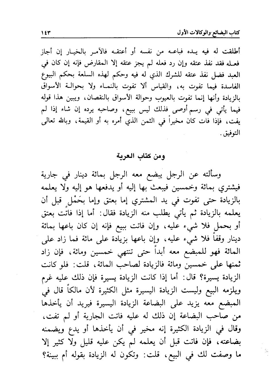 ومن كتاب العرية وسألته عن الرجل يبضع معه الرجل بمائة دينار في جارية فيشتري بمائة وخمسين فيبعث بها إليه أو يدفعها هو إليه ولا يعلمه بالزيادة حتى تفوت في يد المشتري إما بعتق وإما بحمل قبل أن يعلمه بالزيادة ثم يأتي يطلب منه الزيادة فقال: أما إذا فاتت بعتق أو بحمل فلا شيء عليه، وإن فاتت ببيع فإنه إن كان باعها بمائة دينار وقفا فلا شيء عليه، وإن باعها بزيادة على مائة فما زاد على المائة فهو للمبضع معه أبدا حتى تنتهي خمسين ومائة، فإن زاد ثمنها على خمسين ومائة فالزيادة لصاحب المائة، قلت: فلو كانت الزيادة يسيرة؟ قال: أما إذا كانت الزيادة يسيرة فإن ذلك عليه غرم ويلزمه البيع وليست الزيادة اليسيرة مثل الكثيرة لأن مالكا قال في المبضع معه يزيد على البضاعة الزيادة اليسيرة فيريد أن يأخذها من صاحب البضاعة إن ذلك له عليه فاتت الجارية أو لم تفت، وقال في الزيادة الكثيرة إنه مخير في أن يأخذها أو يدع ويضمنه بضاعته، فإن فاتت قبل أن يعلمه لم يكن عليه قليل ولا كثير إلا ما وصفت لك في البيع، قلت: وتكون له الزيادة بقوله أم ببينة؟