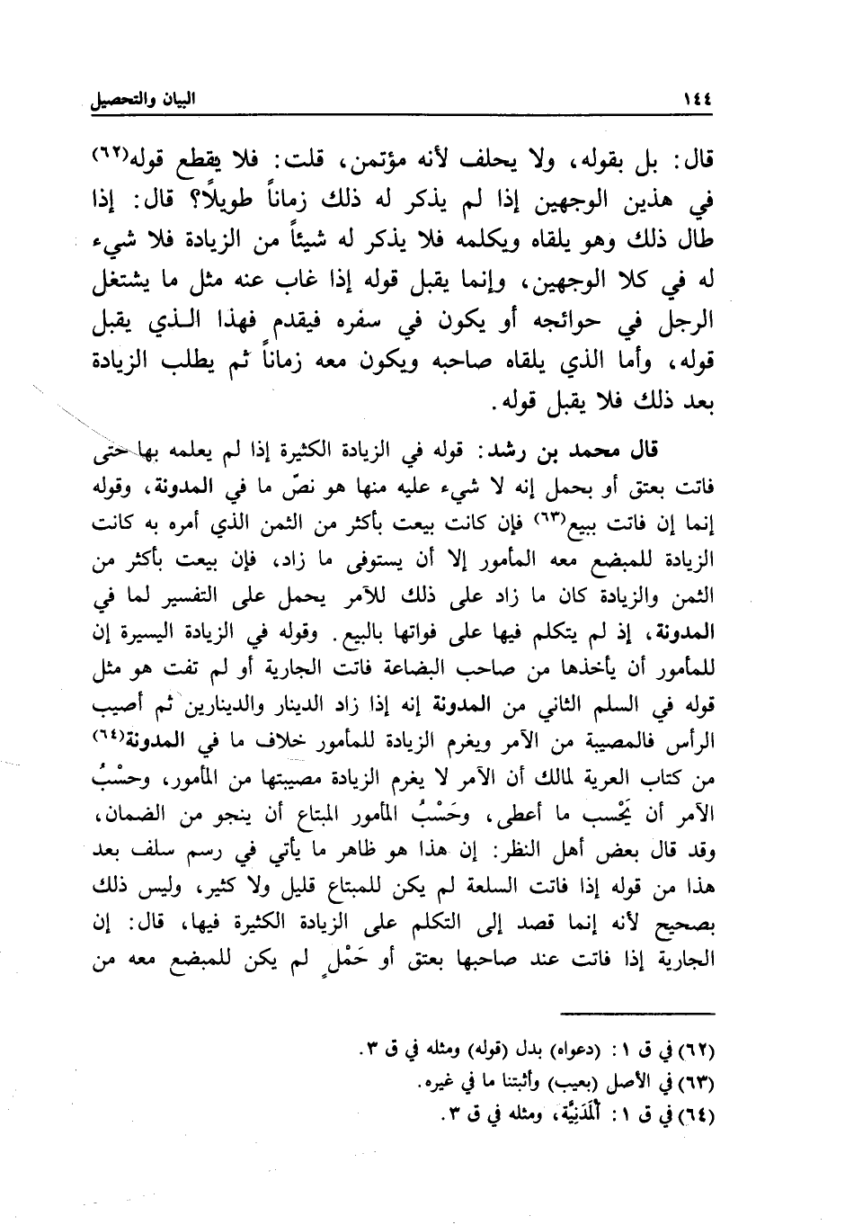 قال محمد بن رشد: قوله في الزيادة الكثيرة إذا لم يعلمه بها حتى فاتت بعتق أو بحمل إنه لا شيء عليه منها هو نص ما في المدونة، وقوله إنما إن فاتت ببيع فإن كانت بيعت بأكثر من الثمن الذي أمره به كانت الزيادة للمبضع معه المأمور إلا أن يستوفى ما زاد، فإن بيعت بأكثر من الثمن والزيادة كان ما زاد على ذلك للآمر يحمل على التفسير لما في المدونة، إذ لم يتكلم فيها على فواتها بالبيع. وقوله في الزيادة اليسيرة إن للمأمور أن يأخذها من صاحب البضاعة فاتت الجارية أو لم تفت هو مثل قوله في السلم الثاني من المدونة إنه إذا زاد الدينار والدينارين ثم أصيب الرأس فالمصيبة من الآمر ويغرم الزيادة للمأمور خلاف ما في المدونة من كتاب العرية لمالك أن الآمر لا يغرم الزيادة مصيبتها من المأمور، وحسب الآمر أن يحسب ما أعطى، وحسب المأمور المبتاع أن ينجو من الضمان، وقد قال بعض أهل النظر: إن هذا هو ظاهر ما يأتي في رسم سلف بعد هذا من قوله إذا فاتت السلعة لم يكن للمبتاع قليل ولا كثير، وليس ذلك بصحيح لأنه إنما قصد إلى التكلم على الزيادة الكثيرة فيها، قال: إن الجارية إذا فاتت عند صاحبها بعتق أو حمل لم يكن للمبضع معه من