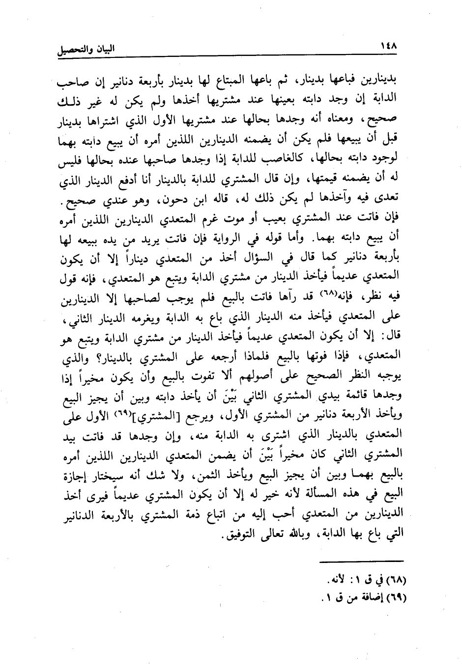 بدينارين فباعها بدينار، ثم باعها المبتاع لها بدينار بأربعة دنانير إن صاحب الدابة إن وجد دابته بعينها عند مشتريها أخذها ولم يكن له غير ذلك صحيح، ومعناه أنه وجدها بحالها عند مشتريها الأول الذي اشتراها بدينار قبل أن يبيعها فلم يكن أن يضمنه الدينارين اللذين أمره أن يبيع دابته بهما لوجود دابته بحالها، كالغاصب للدابة إذا وجدها صاحبها عنده بحالها فليس له أن يضمنه قيمتها، وإن قال المشتري للدابة بالدينار أنا أدفع الدينار الذي تعدى فيه وآخذها لم يكن ذلك له، قاله ابن دحون، وهو عندي صحيح. فإن فاتت عند المشتري بعيب أو موت غرم المتعدي الدينارين اللذين أمره أن يبيع دابته بهما. وأما قوله في الرواية فإن فاتت يريد من يده ببيعه لها بأربعة دنانير كما قال في السؤال أخذ من المتعدي دينارا إلا أن يكون المتعدي عديما فيأخذ الدينار من مشتري الدابة ويتبع هو المتعدي، فإنه قول فيه نظر، فإنه قد رآها فاتت بالبيع فلم يوجب لصاحبها إلا الدينارين على المتعدي فيأخذ منه الدينار الذي باع به الدابة ويغرمه الدينار الثاني، قال: إلا أن يكون المتعدي عديما فيأخذ الدينار من مشتري الدابة ويتبع هو المتعدي، فإذا فوتها بالبيع فلماذا أرجعه على المشتري بالدينار؟ والذي يوجبه النظر الصحيح على أصولهم ألا تفوت بالبيع وأن يكون مخيرا إذا وجدها قائمة بيدي المشتري الثاني بين أن يأخذ دابته وبين أن يجيز البيع ويأخذ الأربعة دنانير من المشتري الأول، ويرجع المشتري، الأول على المتعدي بالدينار الذي اشترى به الدابة منه، وإن وجدها قد فاتت بيد المشتري الثاني كان مخيرا بين أن يضمن المتعدي الدينارين اللذين أمره بالبيع بهما وبين أن يجيز البيع ويأخذ الثمن، ولا شك أنه سيختار إجازة البيع في هذه المسألة لأنه خير له إلا أن يكون المشتري عديما فيرى أخذ الدينارين من المتعدي أحب إليه من اتباع ذمة المشتري بالأربعة الدنانير التي باع بها الدابة، وبالله تعالى التوفيق.