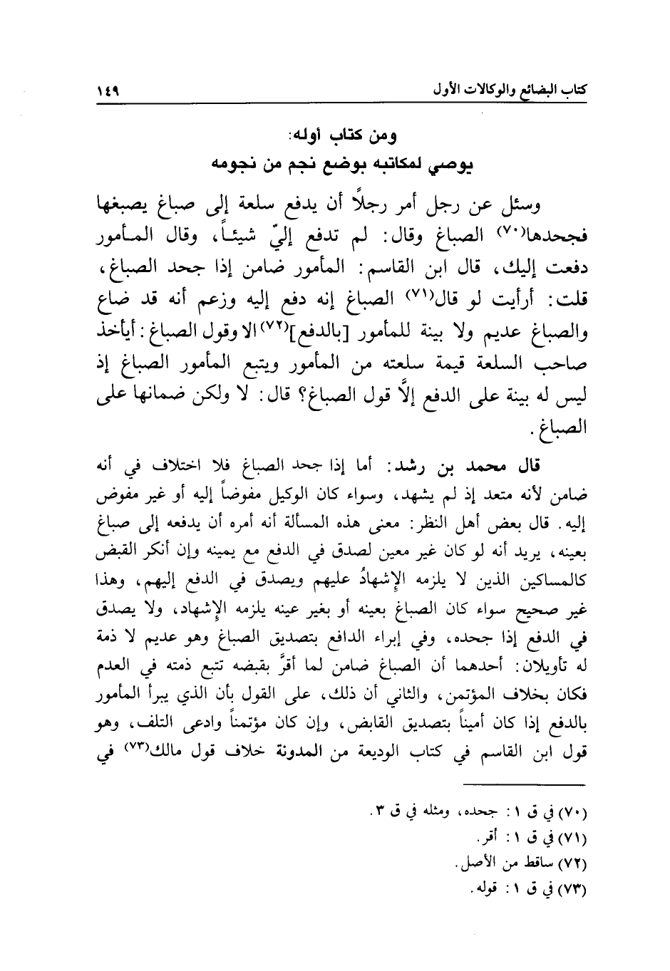 يوصي لمكاتبه بوضع نجم من نجومه وسئل عن رجل أمر رجلا أن يدفع سلعة إلى صباغ يصبغها فجحدها الصباغ وقال: لم تدفع إلي شيئا، وقال المأمور دفعت إليك، قال ابن القاسم: المأمور ضامن إذا جحد الصباغ، قلت: أرأيت لو قال الصباغ إنه دفع إليه وزعم أنه قد ضاع والصباغ عديم ولا بينة للمأمور بالدفع إلا وقول الصباغ: أيأخذ صاحب السلعة قيمة سلعته من المأمور ويتبع المأمور الصباغ إذ ليس له بينة على الدفع إلا قول الصباغ؟ قال: لا ولكن ضمانها على الصباغ.