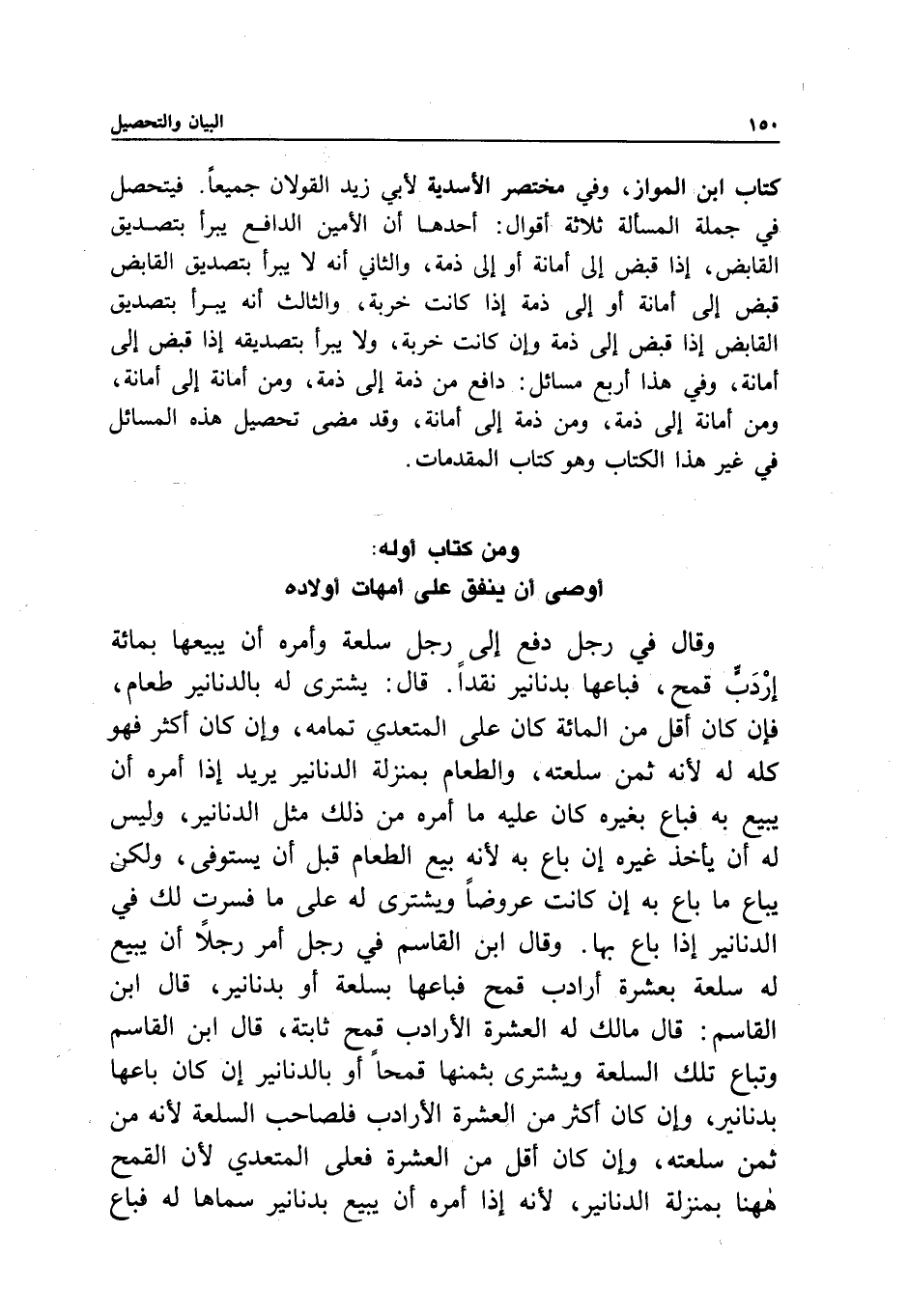 ومن كتاب أوله: أوصى أن ينفق على أمهات أولاده وقال في رجل دفع إلى رجل سلعة وأمره أن يبيعها بمائة إردب قمح، فباعها بدنانير نقدا. قال: يشترى له بالدنانير طعام، فإن كان أقل من المائة كان على المتعدي تمامه، وإن كان أكثر فهو كله له لأنه ثمن سلعته، والطعام بمنزلة الدنانير يريد إذا أمره أن يبيع به فباع بغيره كان عليه ما أمره من ذلك مثل الدنانير، وليس له أن يأخذ غيره إن باع به لأنه بيع الطعام قبل أن يستوفى، ولكن يباع ما باع به إن كانت عروضا ويشترى له على ما فسرت لك في الدنانير إذا باع بها. وقال ابن القاسم في رجل أمر رجلا أن يبيع له سلعة بعشرة أرادب قمح فباعها بسلعة أو بدنانير، قال ابن القاسم. قال مالك له العشرة الأرادب قمح ثابتة، قال ابن القاسم وتباع تلك السلعة ويشترى بثمنها قمحا أو بالدنانير إن كان باعها بدنانير، وإن كانت أكثر من العشرة الأرادب فلصاحب السلعة لأنه من ثمن سلعته، وإن كان أقل من العشرة فعلى المتعدي لأن القمح ههنا بمنزلة الدنانير؛ لأنه إذا أمره أن يبيع بدنانير سماها له فباع