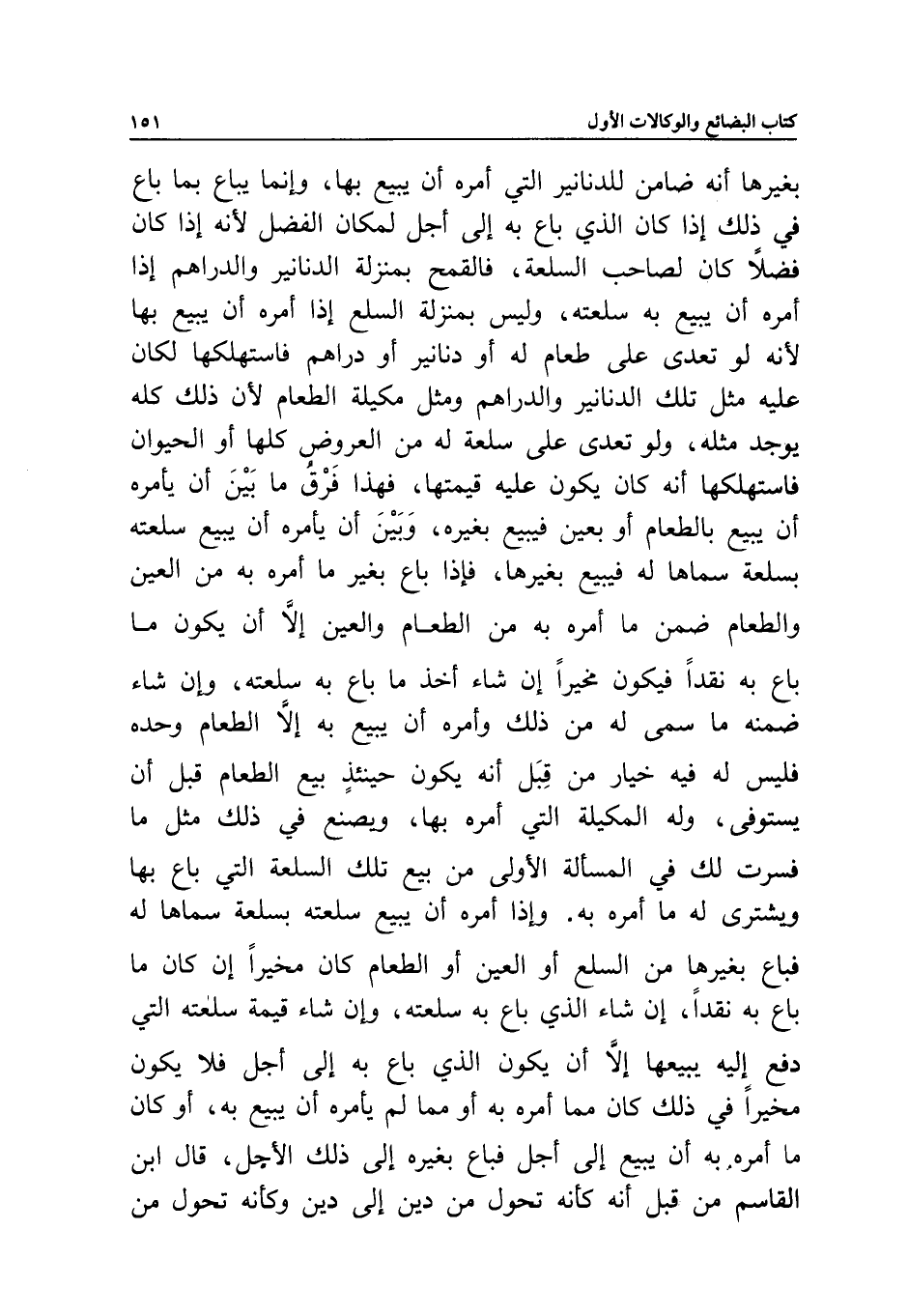 بغيرها أنه ضامن للدنانير التي أمره أن يبيع بها، وإنما يباع بما باع في ذلك إذا كان الذي باع به إلى أجل لمكان الفضل لأنه إذا كان فضلا كان لصاحب السلعة، فالقمح بمنزلة الدنانير والدراهم إذا أمره أن يبيع به سلعته، وليس بمنزلة السلع إذا أمره أن يبيع بها لأنه لو تعدى على طعام له أو دنانير أو دراهم فاستهلكها لكان عليه مثل تلك الدنانير والدراهم ومثل مكيلة الطعام لأن ذلك كله يوجد مثله، ولو تعدى على سلعة له من العروض كلها أو الحيوان فاستهلكها أنه كان يكون عليه قيمتها، فهذا فرق ما بين أن يأمره أن يبيع بالطعام أو بعين فيبيع بغيره، وبين أن يأمره أن يبيع سلعته بسلعة سماها له فيبيع بغيرها، فإذا باع بغير ما أمره به من العين والطعام ضمن ما أمره به من الطعام والعين إلا أن يكون ما باع به نقدا فيكون مخيرا إن شاء أخذ ما باع به سلعته، وإن شاء ضمنه ما سمى له من ذلك وأمره أن يبيع به إلا الطعام وحده فليس له فيه خيار من قبل أنه يكون حينئذ بيع الطعام قبل أن يستوفى، وله المكيلة التي أمره بها، ويصنع في ذلك مثل ما فسرت لك في المسألة الأولى من بيع تلك السلعة التي باع بها ويشترى له ما أمره به. وإذا أمره أن يبيع سلعته بسلعة سماها له فباع بغيرها من السلع أو العين أو الطعام كان مخيرا إن كان ما باع به نقدا، إن شاء الذي باع به سلعته، وإن شاء قيمة سلعته التي دفع إليه يبيعها إلا أن يكون الذي باع به إلى أجل فلا يكون مخيرا في ذلك كان مما أمره به أو مما لم يأمره أن يبيع به، أو كان ما أمره به أن يبيع إلى أجل فباع بغيره إلى ذلك الأجل، قال ابن القاسم من قبل أنه كأنه تحول من دين إلى دين وكأنه تحول من