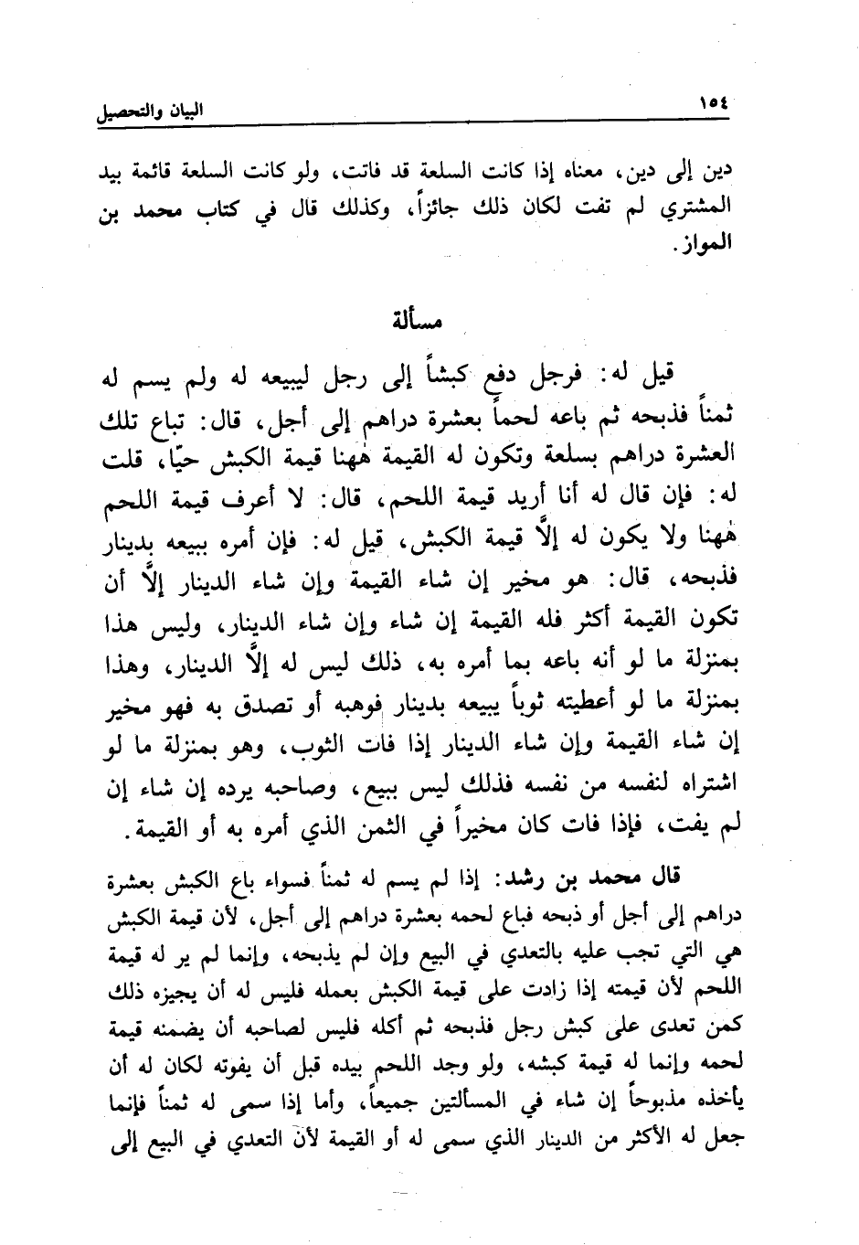 مسألة قيل له: فرجل دفع كبشا إلى رجل ليبيعه له ولم يسم له ثمنا فذبحه ثم باعه لحما بعشرة دراهم إلى أجل، قل: تباع تلك العشرة دراهم بسلعة وتكون له القيمة ههنا قيمة الكبش حيا، قلت له: فإن قال له أنا أريد قيمة اللحم، قال: لا أعرف قيمة اللحم ههنا ولا يكون له إلا قيمة الكبش، قيل له: فإن أمره ببيعه بدينار فذبحه، قال: هو مخير إن شاء القيمة وإن شاء الدينار إلا أن تكون القيمة أكثر فله القيمة إن شاء وإن شاء الدينار، وليس هذا بمنزلة ما لو أنه باعه بما أمره به، ذلك ليس له إلا الدينار، وهذا بمنزلة ما لو أعطيته ثوبا يبيعه بدينار فوهبه أو تصدق به فهو مخير إن شاء القيمة وإن شاء الدينار إذا فات الثوب، وهو بمنزلة ما لو اشتراه لنفسه من نفسه فذلك ليس ببيع، وصاحبه يرده إن شاء إن لم يفت، فإذا فات كان مخيرا في الثمن الذي أمره به أو القيمة.