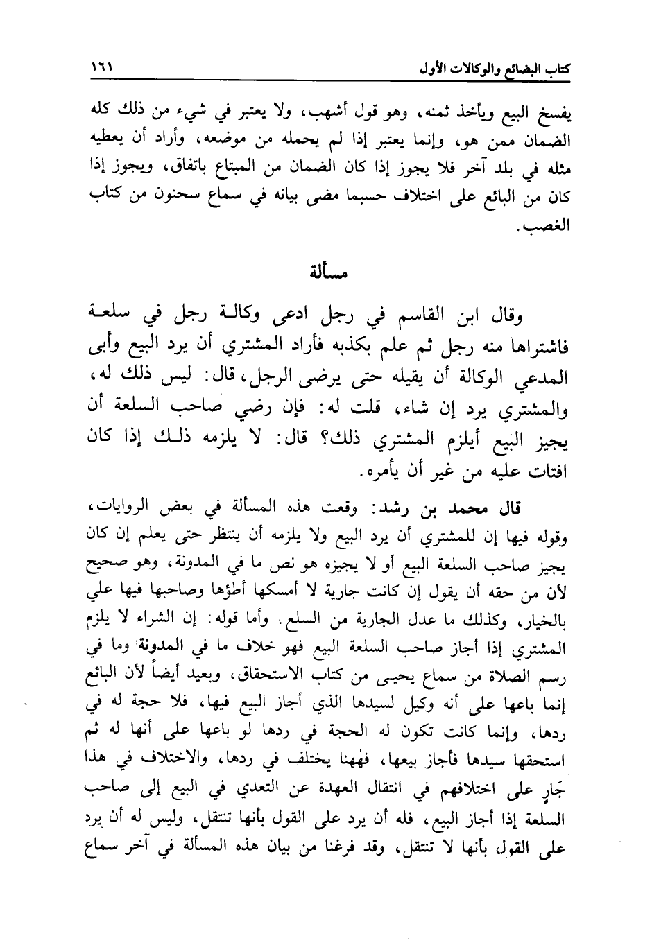 قال محمد بن رشد: وقعت هذه المسألة في بعض الروايات، وقوله فيها إن للمشتري أن يرد البيع ولا يلزمه أن ينتظر حتى يعلم إن كان يجيز صاحب السلعة البيع أو لا يجيزه هو نص ما في المدونة، وهو صحيح لأن من حقه أن يقول إن كانت جارية لا أمسكها أطؤها وصاحبها فيها علي بالخيار، وكذلك ما عدل الجارية من السلع. وأما قوله: إن الشراء لا يلزم المشتري إذا أجاز صاحب السلعة البيع فهو خلاف ما في المدونة وما في رسم الصلاة من سماع يحيى من كتاب الاستحقاق، وبعيد أيضا لأن البائع إنما باعها على أنه وكيل لسيدها الذي أجاز البيع فيها، فلا حجة له في ردها، وإنما كانت تكون له الحجة في ردها لو باعها على أنها له ثم استحقها سيدها فأجاز بيعها، فههنا يختلف في ردها، والاختلاف في هذا جار على اختلافهم في انتقال العهدة عن التعدي في البيع إلى صاحب السلعة إذا أجاز البيع، فله أن يرد على القول بأنها تنتقل، وليس له أن يرد على القول بأنها لا تنتقل، وقد فرغنا من بيان هذه المسألة في آخر سماع