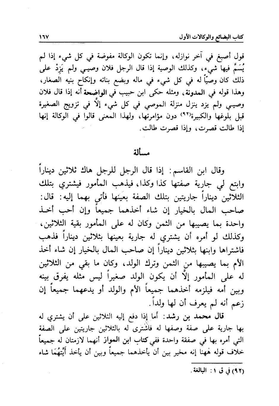 مسألة وقال ابن القاسم: إذا قال الرجل للرجل هاك ثلاثين دينارا وابتع لي جارية صفتها كذا وكذا، فيذهب المأمور فيشتري بتلك الثلاثين دينارا جاريتين بتلك الصفة بعينها فأتى بهما إليه: قال: صاحب المال بالخيار إن شاء أخذهما جميعا وإن أحب أخذ واحدة بما يصيبها من الثمن وكان له على المأمور بقية الثلاثين، وكذلك لو أمره أن يشتري له جارية بعينها بثلاثين دينارا فذهب فاشتراها وابنها بثلاثين دينارا إن صاحب المال بالخيار إن شاء أخذ الأم بما يصيبها من الثمن وترك الولد، وكان ما بقي من الثلاثين له على المأمور إلا أن يكون الولد صغيرا ليس مثله يفرق بينه وبين أمه فيلزمه أخذهما جميعا الأم والولد أو يدعهما جميعا إن زعم أنه لم يعرف أن لها ولدا.