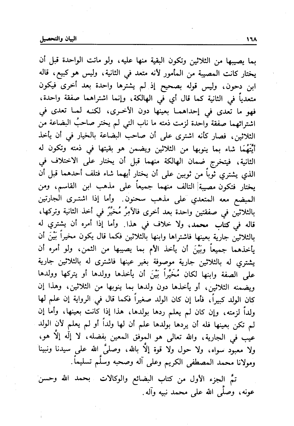 تم الجزء الأول من كتاب البضائع والوكالات بحمد الله وحسن عونه، وصلى الله على محمد نبيه وآله.