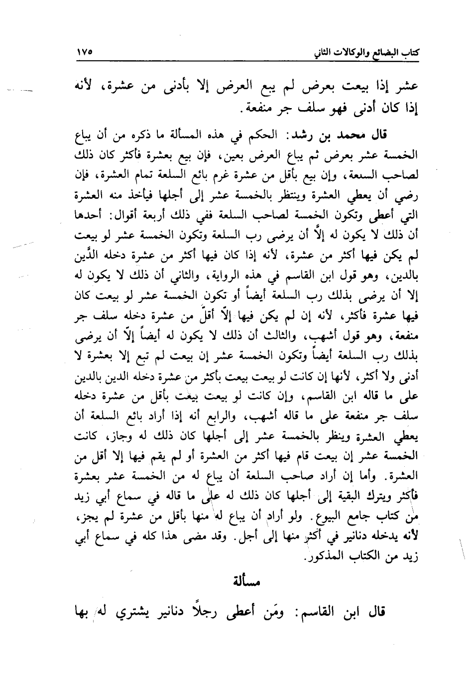 قال محمد بن رشد: الحكم في هذه المسألة ما ذكره من أن يباع الخمسة عشر بعرض ثم يباع العرض بعين، فإن بيع بعشرة فأكثر كان ذلك لصاحب السمعة، وإن بيع بأقل من عشرة غرم بائع السلعة تمام العشرة، فإن رضي أن يعطي العشرة وينتظر بالخمسة عشر إلى أجلها فيأخذ منه العشرة التي أعطى وتكون الخمسة لصاحب السلعة ففي ذلك أربعة أقوال: أحدها أن ذلك لا يكون له إلا أن يرضى رب السلعة وتكون الخمسة عشر لو بيعت لم يكن فيها أكثر من عشرة؛ لأنه إذا كان فيها أكثر من عشرة دخله الدين بالدين، وهو قول ابن القاسم في هذه الرواية، والثاني أن ذلك لا يكون له إلا أن يرضى بذلك رب السلعة أيضا أو تكون الخمسة عشر لو بيعت كان فيها عشرة فأكثر؛ لأنه إن لم يكن فيها إلا أقل من عشرة دخله سلف جر منفعة، وهو قول أشهب، والثالث أن ذلك لا يكون له أيضا إلا أن يرضى بذلك رب السلعة أيضا وتكون الخمسة عشر إن بيعت لم تبع إلا بعشرة لا أدنى ولا أكثر؛ لأنها إن كانت لو بيعت بيعت بأكثر من عشرة دخله الدين بالدين على ما قاله ابن القاسم، وإن كانت لو بيعت بيعت بأقل من عشرة دخله سلف جر منفعة على ما قاله أشهب، والرابع أنه إذا أراد بائع السلعة أن يعطي العشرة وينظر بالخمسة عشر إلى أجلها كان ذلك له وجاز، كانت الخمسة عشر إن بيعت قام فيها أكثر من العشرة أو لم يقم فيها إلا أقل من العشرة. وأما إن أراد صاحب السلعة أن يباع له من الخمسة عشر بعشرة فأكثر ويترك البقية إلى أجلها كان ذلك له على ما قاله في سماع أبي زيد من كتاب جامع البيوع. ولو أراد أن يباع له منها بأقل من عشرة لم يجز؛ لأنه يدخله دنانير في أكثر منها إلى أجل. وقد مضى هذا كله في سماع أبي زيد من الكتاب المذكور.