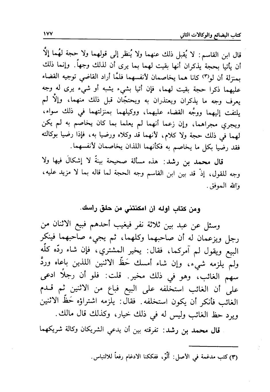 قال محمد بن رشد: تفرقته بين أن يدعي الشريكان وكالة شريكهما