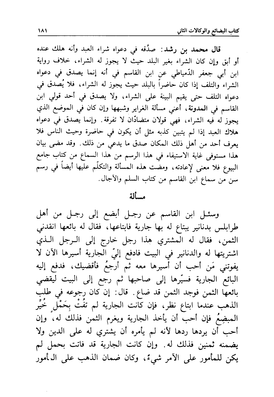 قال محمد بن رشد: صدقه في دعواه شراء العبد وأنه هلك عنده أو أبق وإن كان الشراء بغير البلد حيث لا يجوز له الشراء، خلاف رواية ابن أبي جعفر الدمياطي عن ابن القاسم في أنه إنما يصدق في دعواه الشراء والتلف إذا كان حاضرا بالبلد حيث يجوز له الشراء، فلا يصدق في دعواه التلف حتى يقيم البينة على الشراء، ولا يصدق في أحد قولي ابن القاسم في المدونة، أعني مسألة الغراير وشبهها وإن كان في الموضع الذي يجوز له فيه الشراء، فهي قولان متضادان لا تفرقة. وإنما يصدق في دعواه هلاك العبد إذا لم يتبين كذبه مثل أن يكون في حاضرة وحيث الناس فلا يعرف أحد من أهل ذلك المكان صدق ما يدعي من ذلك. وقد مضى بيان هذا مستوفى غاية الاستيفاء في هذا الرسم من هذا السماع من كتاب جامع البيوع فلا معنى لإعادته، ومضت هذه المسألة والتكلم عليها أيضا في رسم سن من سماع ابن القاسم من كتاب السلم والآجال.