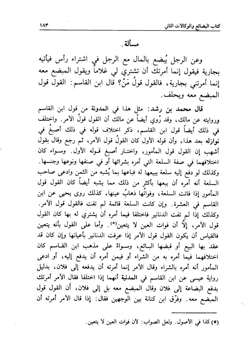 مسألة وعن الرجل يبضع بالمال مع الرجل في اشتراء رأس فيأتيه بجارية فيقول إنما أمرتك أن تشتري لي غلاما ويقول المبضع معه إنما أمرتني بجارية، فالقول قول من؟ قال ابن القاسم: القول قول المبضع معه ويحلف.