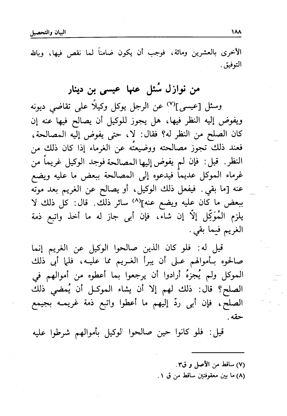 من نوازل سئل عنها عيسى بن دينار وسئل [عيسى] عن الرجل يوكل وكيلا على تقاضي ديونه ويفوض إليه النظر فيها، هل يجوز للوكيل أن يصالح فيها عنه إن كان الصلح من النظر له؟ فقال: لا، حتى يفوض إليه المصالحة، فعند ذلك تجوز مصالحته ووضيعته عن الغرماء إذا كان ذلك من النظر. قيل: فإن لم يفوض المصالحة فوجد الوكيل غريما من غرماء الموكل عديما فيدعوه إلى المصالحة ببعض ما عليه ويضع عنه [ما بقي. فيفعل ذلك الوكيل، أو يصالح عن الغريم بعد موته ببعض ما كان عليه ويضع عنه] سائر ذلك. قال: كل ذلك لا يلزم الموكل إلا إن شاء، فإن أبى جاز له ما أخذ واتبع ذمة الغريم فيما بقي.