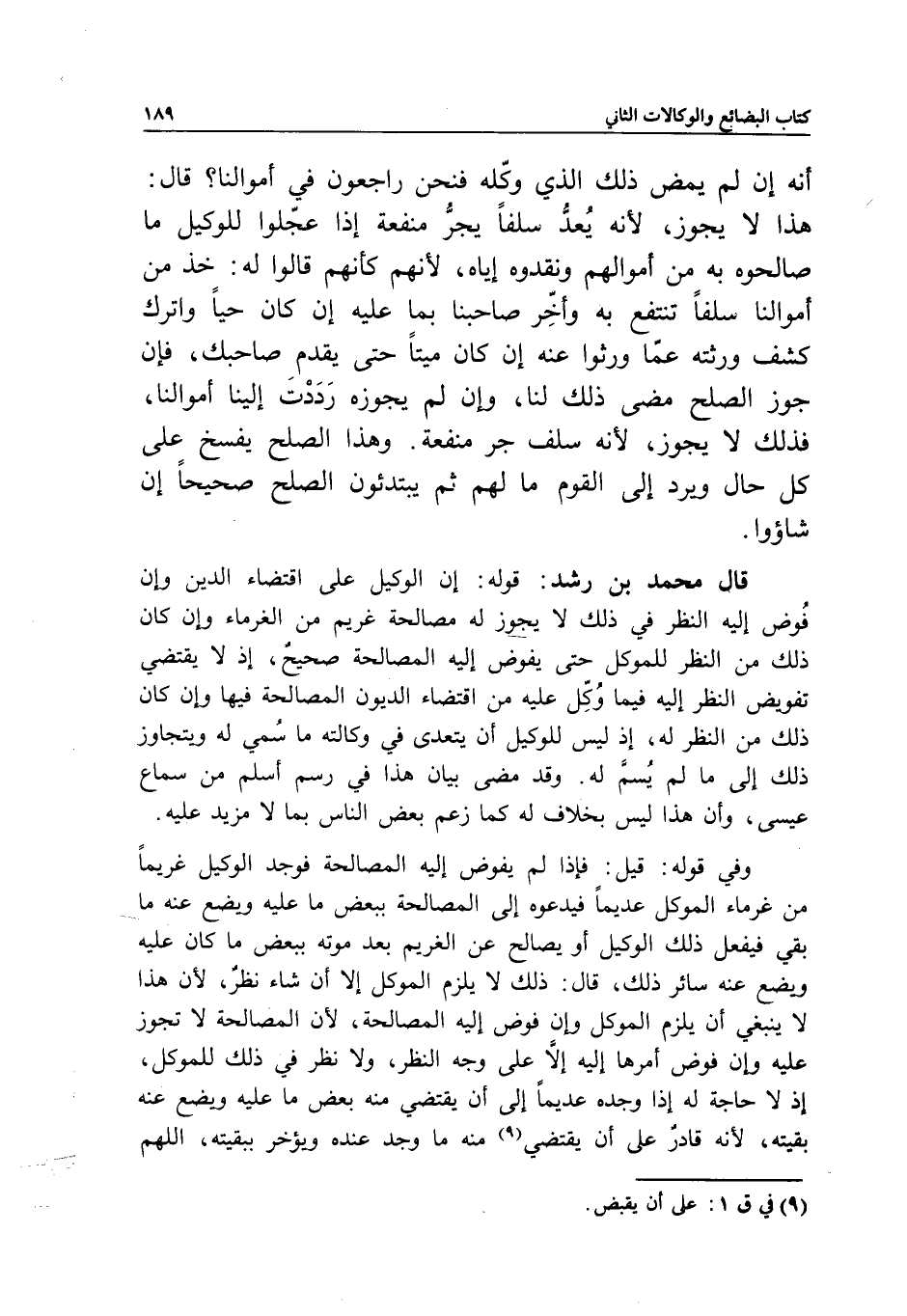 أنه إن لم يمض ذلك الذي وكله فنحن راجعون في أموالنا؟ قال؛ هذا لا يجوز؛ لأنه يعد سلفا يجر منفعة إذا عجلوا للوكيل ما صالحوه به من أموالهم ونقدوه إياه؛ لأنهم كأنهم قالوا له: خذ من أموالنا سلفا تنتفع به وأخر صاحبنا بما عليه إن كان حيا واترك كشف ورثته عما ورثوا عنه إن كان ميتا حتى يقدم صاحبك، فإن جوز الصلح مضى ذلك لنا، وإن لم يجوزه رددت إلينا أموالنا، فذلك لا يجوز؛ لأنه سلف جر منفعة. وهذا الصلح يفسخ على كل حال ويرد إلى القوم ما لهم يبتدئون الصلح صحيحا إن شاءوا.