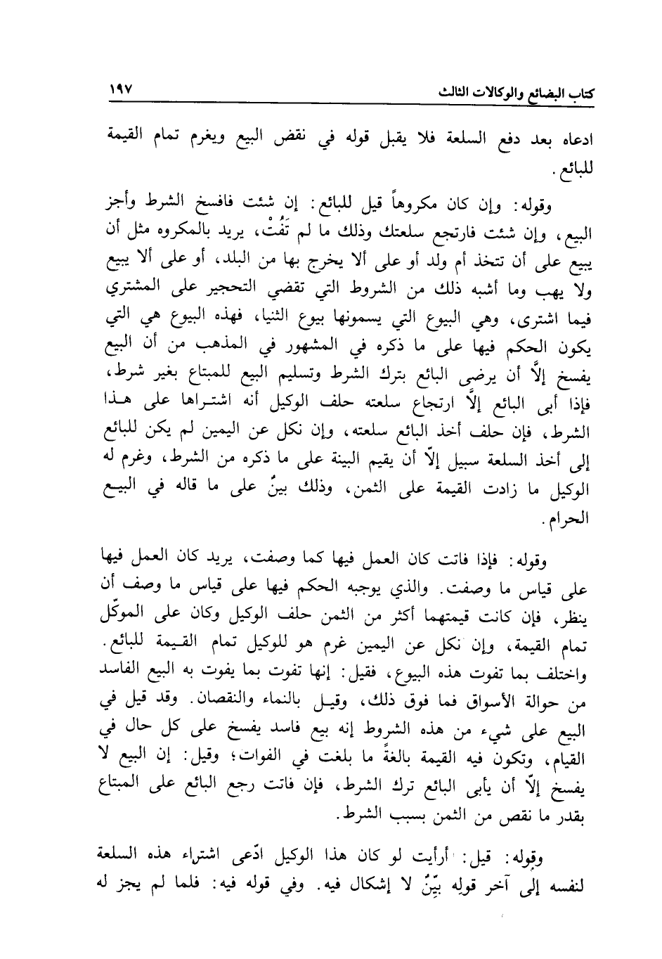 وقوله: وإن كان مكروها قيل للبائع: إن شئت فافسخ الشرط وأجز البيع، وإن شئت فارتجع سلعتك وذلك ما لم تفت، يريد بالمكروه مثل أن يبيع على أن تتخذ أم ولد أو على ألا يخرج بها من البلد، أو على ألا يبيع ولا يهب وما أشبه ذلك من الشروط التي تقضي التحجير على المشتري فيما اشترى، وهي البيوع التي يسمونها بيوع الثنيا، فهذه البيوع هي التي يكون الحكم فيها على ما ذكره في المشهور في المذهب من أن البيع يفسخ إلا أن يرضى البائع بترك الشرط وتسليم البيع للمبتاع بغير شرط، فإذا أبى البائع إلا ارتجاع سلعته حلف الوكيل أنه اشتراها على هذا الشرط، فإن حلف أخذ البائع سلعته، وإن نكل عن اليمين لم يكن للبائع إلى أخذ السلعة سبيل إلا أن يقيم البينة على ما ذكره من الشرط، وغرم له الوكيل ما زادت القيمة على الثمن، وذلك بين على ما قاله في البيع الحرام. وقوله: فإذا فاتت كان العمل فيها كما وصفت، يريد كان العمل فيها على قياس ما وصفت. والذي يوجبه الحكم فيها على قياس ما وصف أن ينظر، فإن كانت قيمتهما أكثر من الثمن حلف الوكيل وكان على الموكل تمام القيمة، وإن نكل عن اليمين غرم هو للوكيل تمام القيمة للبائع. واختلف بما تفوت هذه البيوع، فقيل: إنها تفوت بما يفوت به البيع الفاسد من حوالة الأسواق فما فوق ذلك، وقيل بالنماء والنقصان. وقد قيل في البيع على شيء من هذه الشروط إنه بيع فاسد يفسخ على كل حال في القيام، وتكون فيه القيمة بالغة ما بلغت في الفوات؛ وقيل: إن البيع لا يفسخ إلا أن يأبى البائع ترك الشرط، فإن فاتت رجع البائع على المبتاع بقدر ما نقص من الثمن بسبب الشرط.