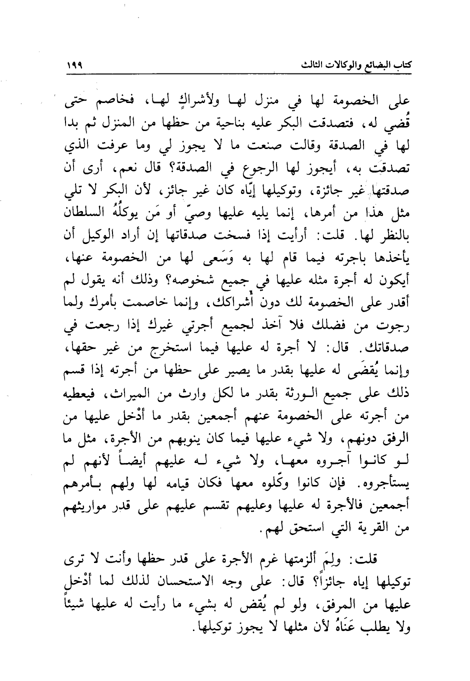 قلت: ولم ألزمتها غرم الأجرة على قدر حظها وأنت لا ترى توكيلها إياه جائزا؟ قال: على وجه الاستحسان لذلك لما أدخل عليها من المرفق، ولو لم يقض له بشيء ما رأيت له عليها شيئا ولا يطلب عناه لأن مثلها لا يجوز توكيلها.
