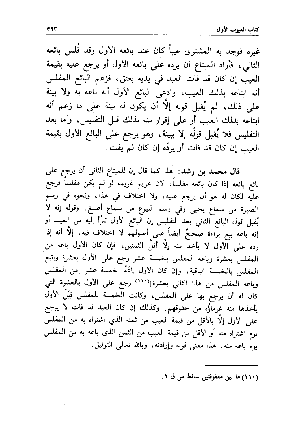 غيره فوجد به المشتري عيبا كان عند بائعه الأول، وقد فلس بائعه الثاني، فأراد المبتاع أن يرده على بائعه الأول أو يرجع عليه بقيمة العيب إن كان قد فات العبد في يديه بعتق، فزعم البائع المفلس أنه ابتاعه بذلك العيب، وادعى البائع الأول أنه باعه به ولا بينة على ذلك، لم يقبل قوله إلا أن يكون له بينة على ما زعم أنه ابتاعه بذلك العيب أو على إقرار منه بذلك قبل التفليس، وأما بعد التفليس فلا يقبل قوله إلا ببينة، وهو يرجع على البائع الأول بقيمة العيب إن كان قد فات أو يرده إن كان لم يفت.