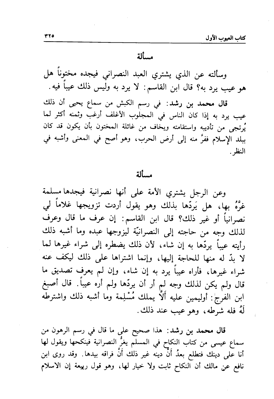 مسألة وسألته: عن الذي يشتري العبد النصراني فيجده مختونا هل هو عيب يرد به؟ قال ابن القاسم: لا يرد به وليس ذلك عيبا فيه.