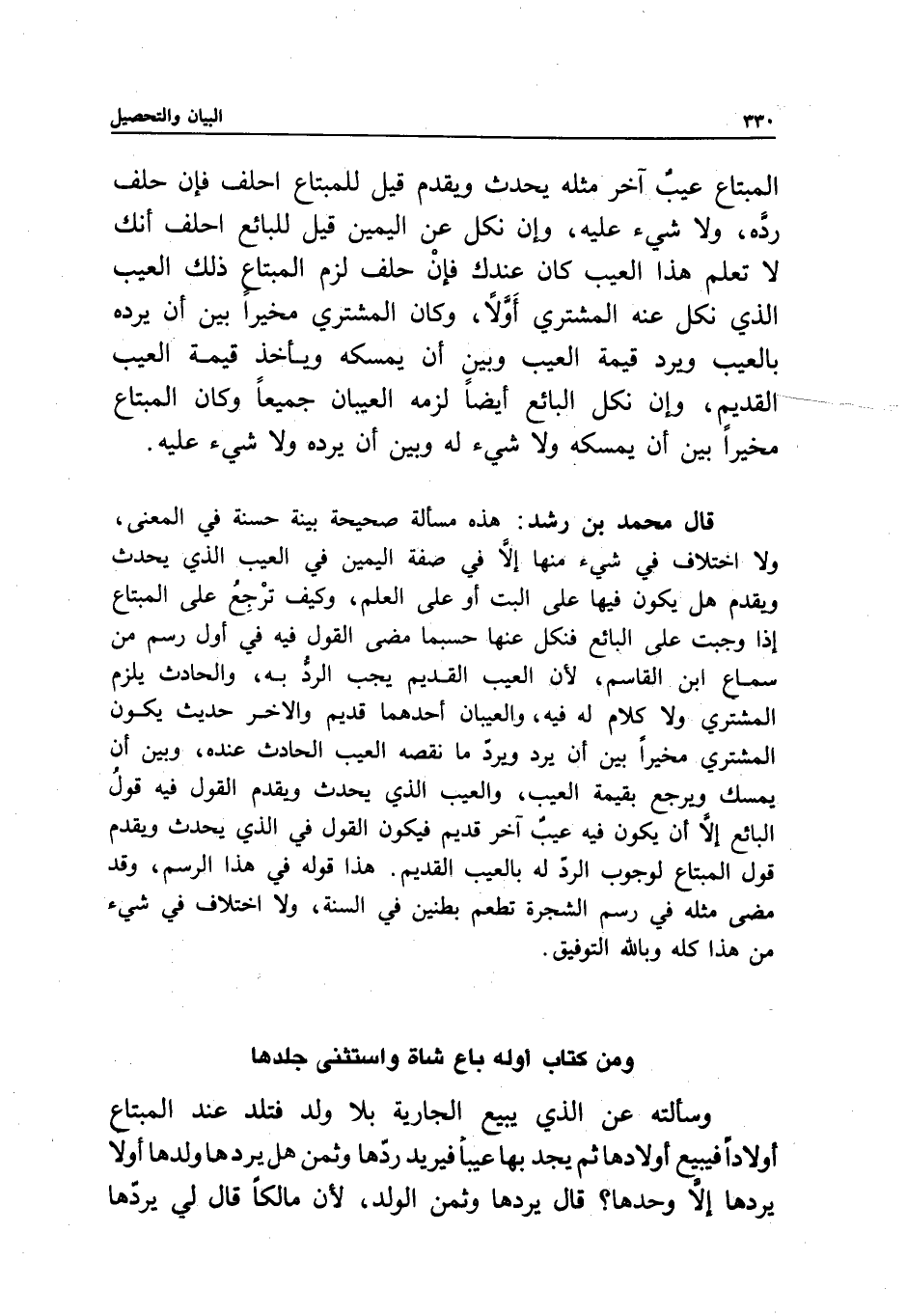 ومن كتاب أوله باع شاة واستثنى جلدها وسألته: عن الذي يبيع الجارية بلا ولد فتلد عند المبتاع أولادا فيبيع أولادها، ثم يجد بها عيبا فيريد ردها وثمن هل يردها ولدها أو لا يردها إلا وحدها؟ قال: يردها وثمن الولد؛ لأن مالكا قال لي: يردها