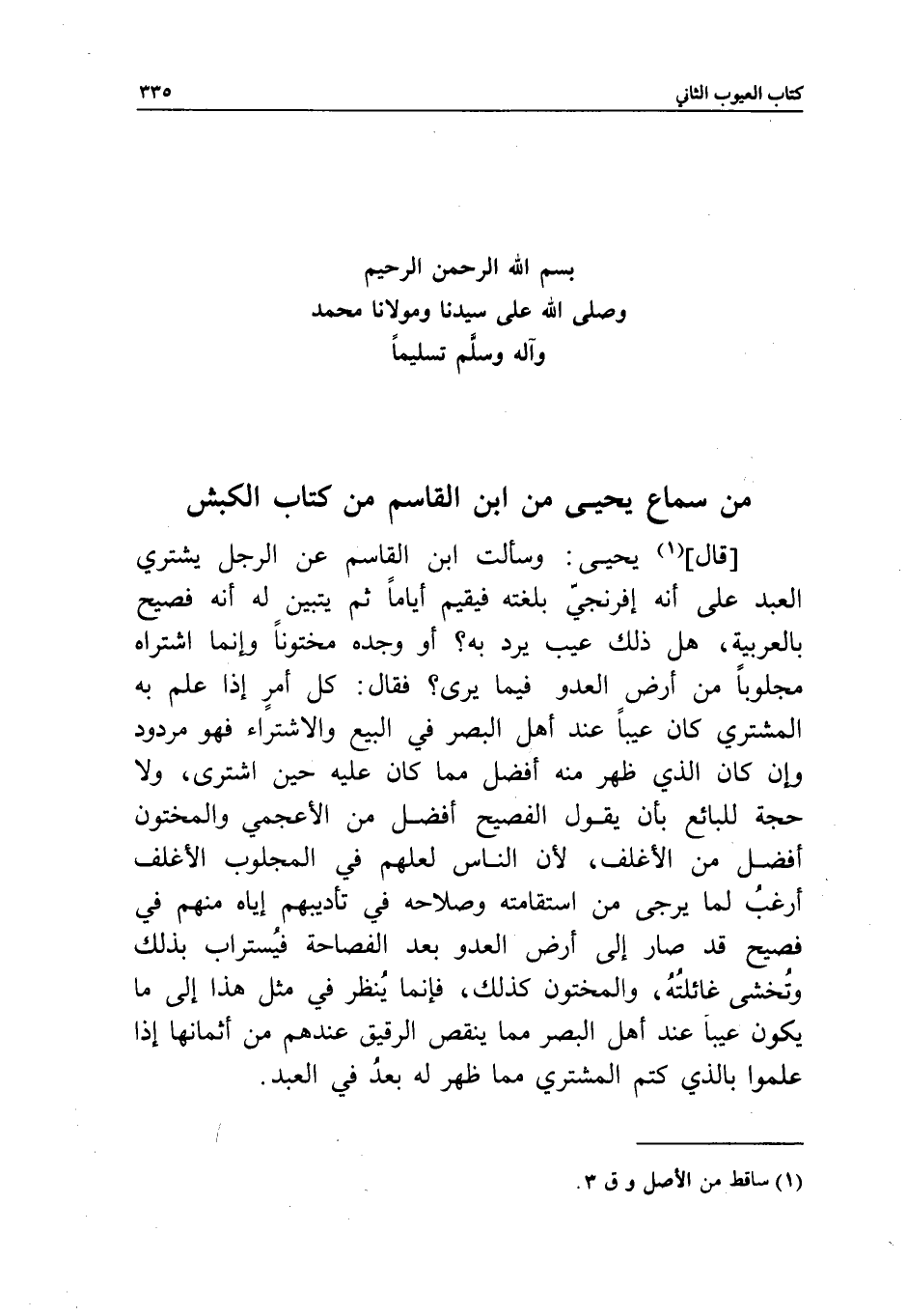 وآله وسلم تسليما من سماع يحيى من ابن القاسم من كتاب الكبش [قال] يحيى: وسألت ابن القاسم: عن الرجل يشتري العبد على أنه إفرنجي بلغته فيقيم أياما ثم يتبين له أنه فصيح بالعربية، هل ذلك عيب يرد به؟ أو وجده مختونا، وإنما اشتراه مجلوبا من أرض العدو فيما يرى؟ فقال: كل أمر إذا علم به المشتري كان عيبا عند أهل البصر في البيع والاشتراء فهو مردود، وإن كان الذي ظهر منه أفضل مما كان عليه حين اشترى، ولا حجة للبائع بأن يقول الفصيح أفضل من الأعجمي والمختون أفضل من الأغلف؛ لأن الناس لعلهم في المجلوب الأغلف أرغب لما يرجى من استقامته وصلاحه في تأديبهم إياه منهم في فصيح قد صار إلى أرض العدو بعد الفصاحة فيستراب بذلك وتخشى غائلته، والمختون كذلك، فإنما ينظر في مثل هذا إلى ما يكون عيبا عند أهل البصر مما ينقص الرقيق عندهم من أثمانها إذا علموا بالذي كتم المشتري مما ظهر له بعد في العبد.