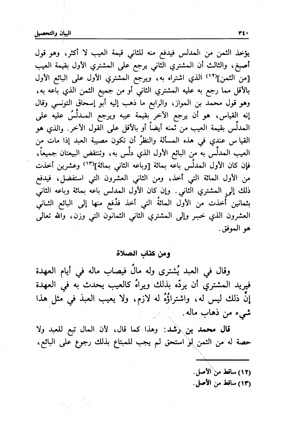 والثالث: أن المشتري الثاني يرجع على المشتري الأول بقيمة العيب [من الثمن] ، الذي اشتراه به، ويرجع المشتري الأول على البائع الأول بالأقل مما رجع به عليه المشتري الثاني أو من جميع الثمن الذي باعه به، وهو قول محمد بن المواز.