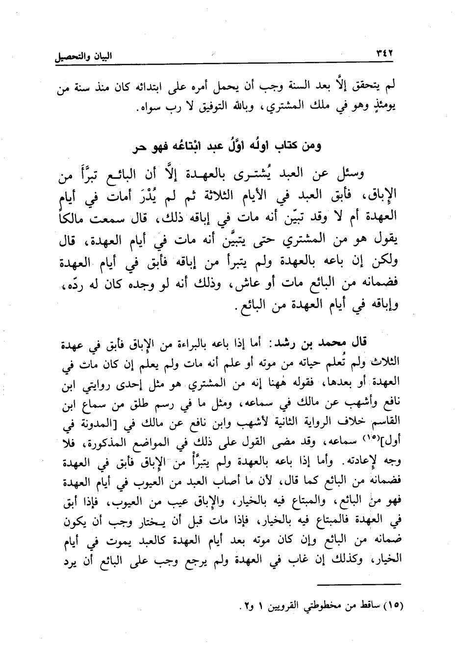 ومن كتاب أوله أول عبد أبتاعه فهو حر وسئل: عن العبد يشترى بالعهدة إلا أن البائع تبرأ من الإباق، فأبق العبد في الأيام الثلاثة ثم لم يدر أمات في أيام العهدة أم لا وقد تبين أنه مات في إباقه ذلك، قال: سمعت مالكا يقول: هو من المشتري حتى يتبين أنه مات في أيام العهدة، قال: ولكن إن باعه بالعهدة ولم يتبرأ من إباقه فأبق في أيام العهدة فضمانه من البائع مات أو عاش، وذلك أنه لو وجده كان له رده، وإباقه في أيام العهدة من البائع.