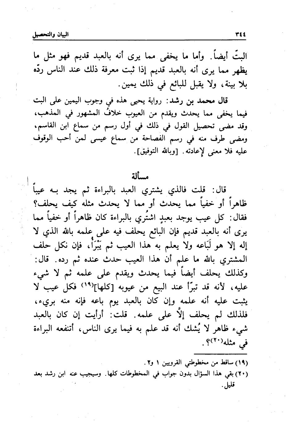 قال محمد بن رشد: رواية يحيى هذه في وجوب اليمين على البت فيما يخفى مما يحدث ويقدم من العيوب خلاف المشهور في المذهب، وقد مضى تحصيل القول في ذلك في أول رسم من سماع ابن القاسم، ومضى طرف منه في رسم الفصاحة من سماع عيسى لمن أحب الوقوف عليه فلا معنى لإعادته. [وبالله التوفيق] .