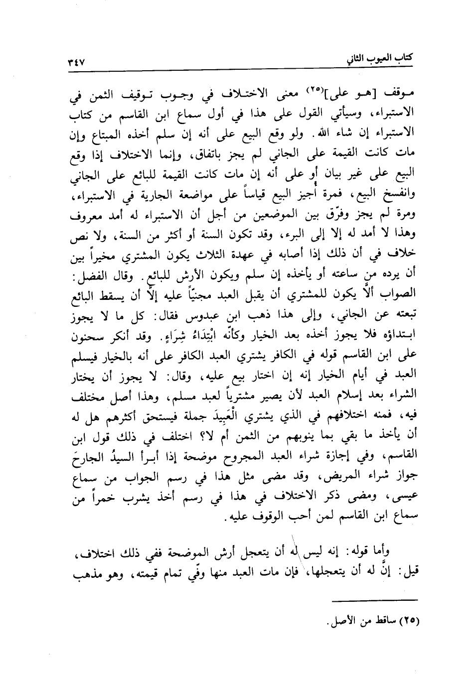موقف [هو على] معنى الاختلاف في وجوب توقيف الثمن في الاستبراء، وسيأتي القول على هذا في أول سماع ابن القاسم من كتاب الاستبراء إن شاء الله، ولو وقع البيع على أنه إن سلم أخذه المبتاع، وإن مات كانت القيمة على الجاني لم يجز باتفاق، وإنما الاختلاف إذا وقع البيع على غير بيان أو على أنه إن مات كانت القيمة للبائع على الجاني وانفسخ البيع، فمرة أجيز البيع قياسا على مواضعة الجارية في الاستبراء، ومرة لم يجز وفرق بين الموضعين من أجل أن الاستبراء له أمد معروف وهذا لا أمد له إلا إلى البرء، وقد تكون السنة أو أكثر من السنة، ولا نص خلاف في أن ذلك إذا أصابه في عهدة الثلاث يكون المشتري مخيرا بين أن يرده من ساعته أو يأخذه إن سلم ويكون الأرش للبائع.