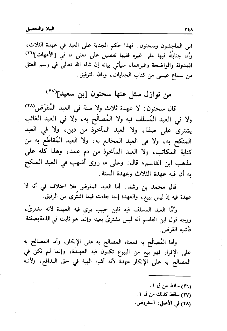 من نوازل سئل عنها سحنون [بن سعيد] قال سحنون: لا عهدة ثلاث ولا سنة في العبد المقرض ولا في العبد المسلف فيه ولا المصالح به، ولا في العبد الغائب يشترى على صفة، ولا العبد المأخوذ من دين، ولا في العبد المنكح به، ولا في العبد المخالع به، ولا العبد المقاطع به من كتابة المكاتب، ولا العبد المأخوذ من دم عمد، وهذا كله على مذهب ابن القاسم؛ قال: وعلى ما روى أشهب في العبد المنكح به أن فيه عهدة الثلاث وعهدة السنة.
