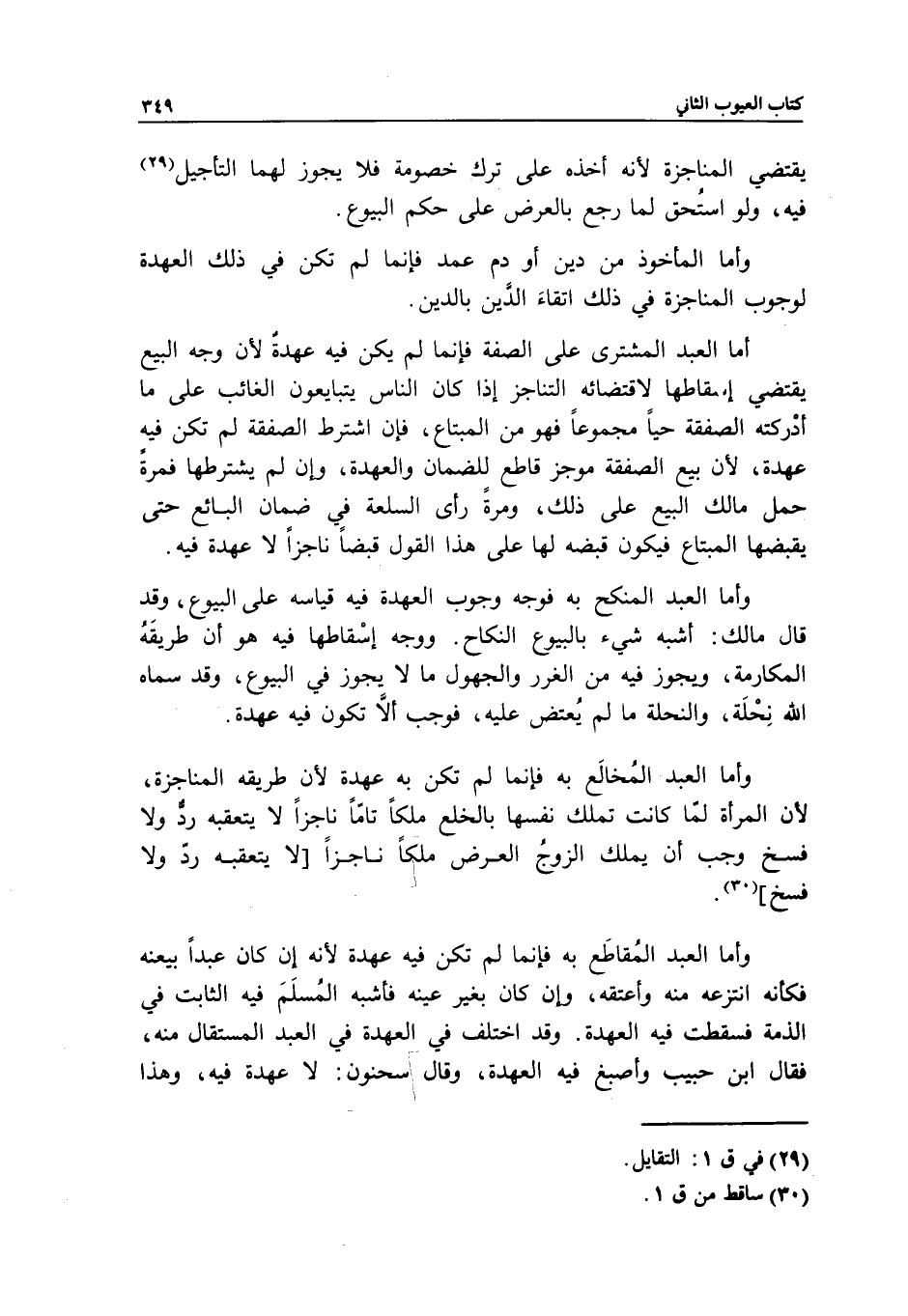 وأما العبد المقاطع به: فإنما لم تكن فيه عهدة؛ لأنه إن كان عبدا بيعنه فكأنه انتزعه منه وأعتقه، وإن كان بغير عينه فأشبه المسلم فيه الثابت في الذمة فسقطت فيه العهدة.