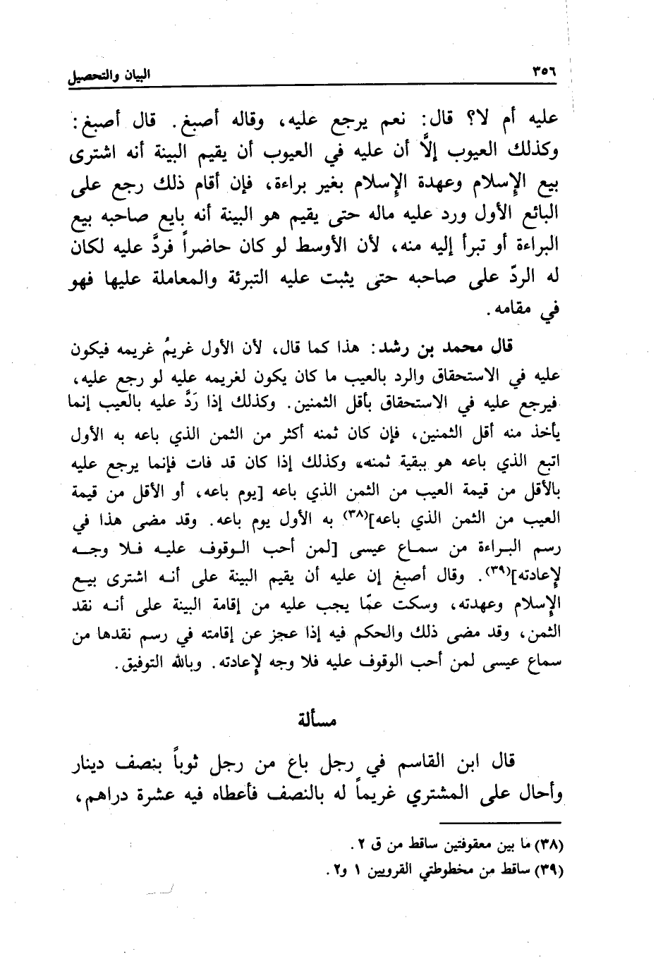 وقال أصبغ: إن عليه أن يقيم البينة على أنه اشترى بيع الإسلام وعهدته، وسكت عما يجب عليه من إقامة البينة على أنه نقد الثمن، وقد مضى ذلك والحكم فيه إذا عجز عن إقامته في رسم نقدها من سماع عيسى لمن أحب الوقوف عليه فلا وجه لإعادته. وبالله التوفيق.