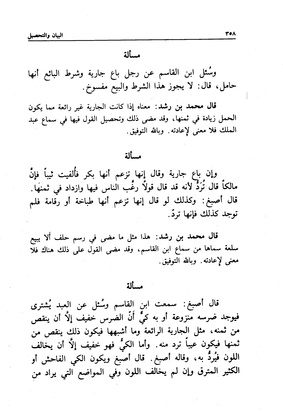 مسألة وسئل ابن القاسم: عن رجل باع جارية وشرط البائع أنها حامل، قال: لا يجوز هذا الشرط والبيع مفسوخ.
