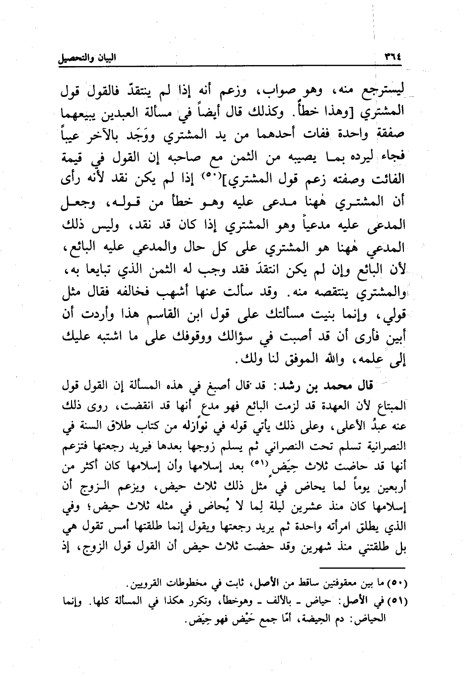 قال محمد بن رشد: قد قال أصبغ في هذه المسألة: إن القول قول المبتاع؛ لأن العهدة قد لزمت البائع فهو مدع أنها قد انقضت، روى ذلك عنه عبد الأعلى، وعلى ذلك يأتي قوله في نوازله من كتاب طلاق السنة في النصرانية تسلم تحت النصراني ثم يسلم زوجها بعدها فيريد رجعتها فتزعم أنها قد حاضت ثلاث حيض بعد إسلامها وأن إسلامها كان أكثر من أربعين يوما لما يحاض في مثل ذلك ثلاث حيض، ويزعم الزوج أن إسلامها كان منذ عشرين ليلة لما لا يحاض في مثله ثلاث حيض؛ وفي الذي يطلق امرأته واحدة ثم يريد رجعتها ويقول: إنما طلقتها أمس تقول هي: بل طلقتني منذ شهرين وقد حضت ثلاث حيض أن القول قول الزوج، إذ