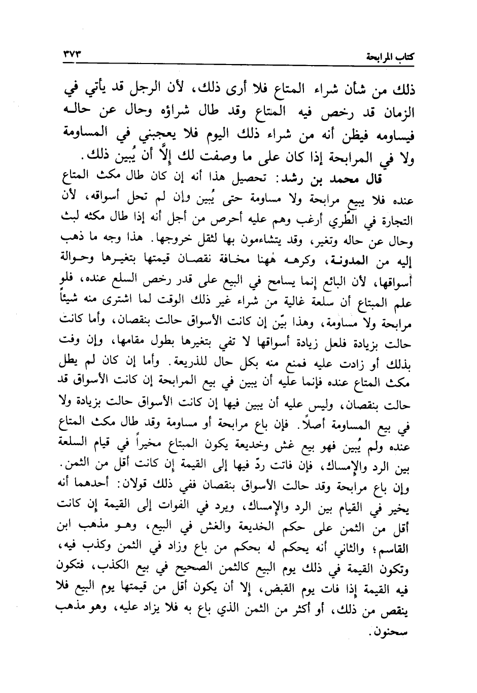 قال محمد بن رشد: تحصيل هذا أنه إن كان طال مكث المتاع عنده فلا يبيع مرابحة ولا مساومة حتى يبين، وإن لم تحل أسواقه؛ لأن التجارة في الطري أرغب وهم عليه أحرص من أجل أنه إذا طال مكثه لبث وحال عن حاله وتغير، وقد يتشاءمون بها لثقل خروجها، هذا وجه ما ذهب إليه من المدونة، وكرهه ههنا مخافة نقصان قيمتها بتغيرها وحوالة أسواقها؛ لأن البائع إنما يسامح في البيع على قدر رخص السلع عنده، فلو علم المبتاع أن سلعة غالية من شراء غير ذلك الوقت لما اشترى منه شيئا مرابحة ولا مساومة، وهذا بين إن كانت الأسواق حالت بنقصان، وأما كانت حالت بزيادة فلعل زيادة أسواقها لا تفي بتغيرها بطول مقامها، وإن وفت بذلك أو زادت عليه فمنع منه بكل حال للذريعة.